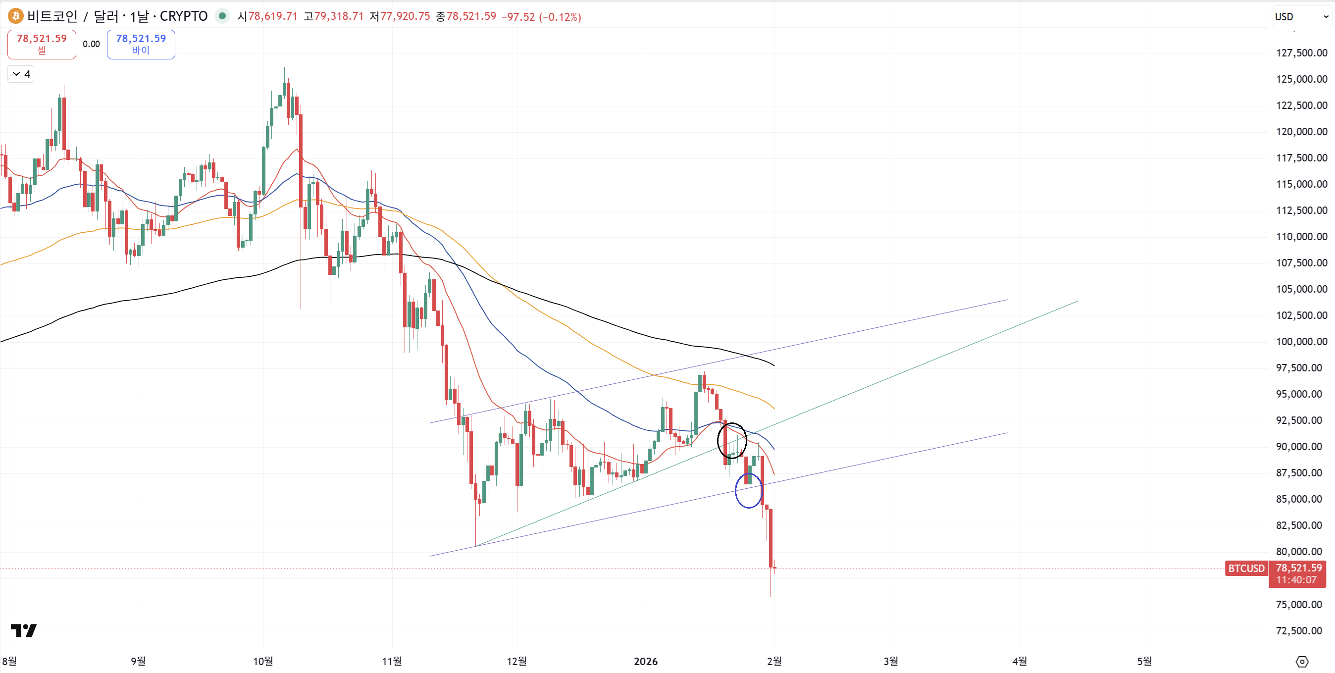 차트는 주봉이지만 사실상 하락은 금요일 하루에 다 나왔습니다.