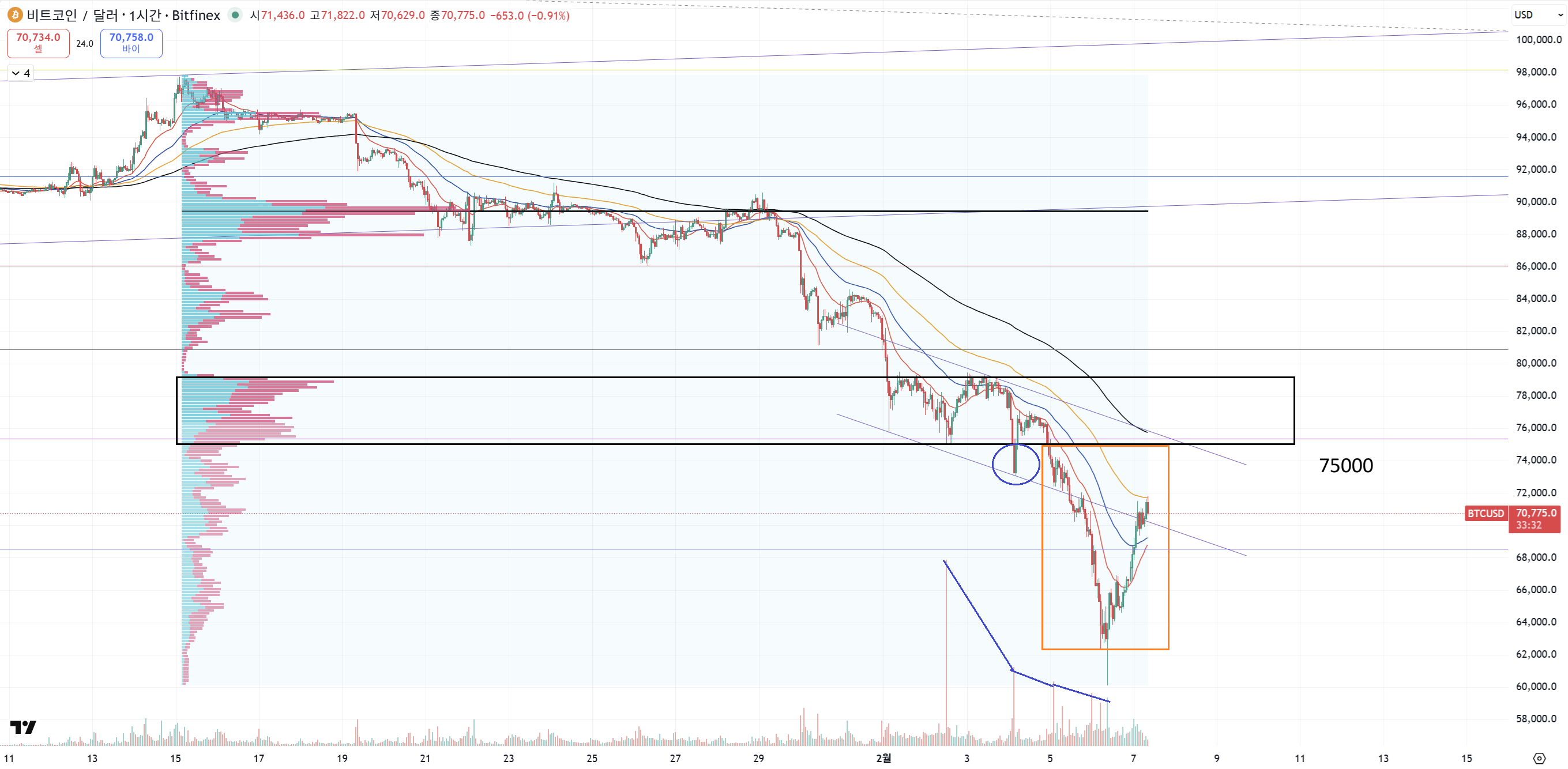 단기적인 상황이긴 한데 지금의 75000은 이전의 95000과 비슷한 의미를 갖는 자리가 됐습니다.
