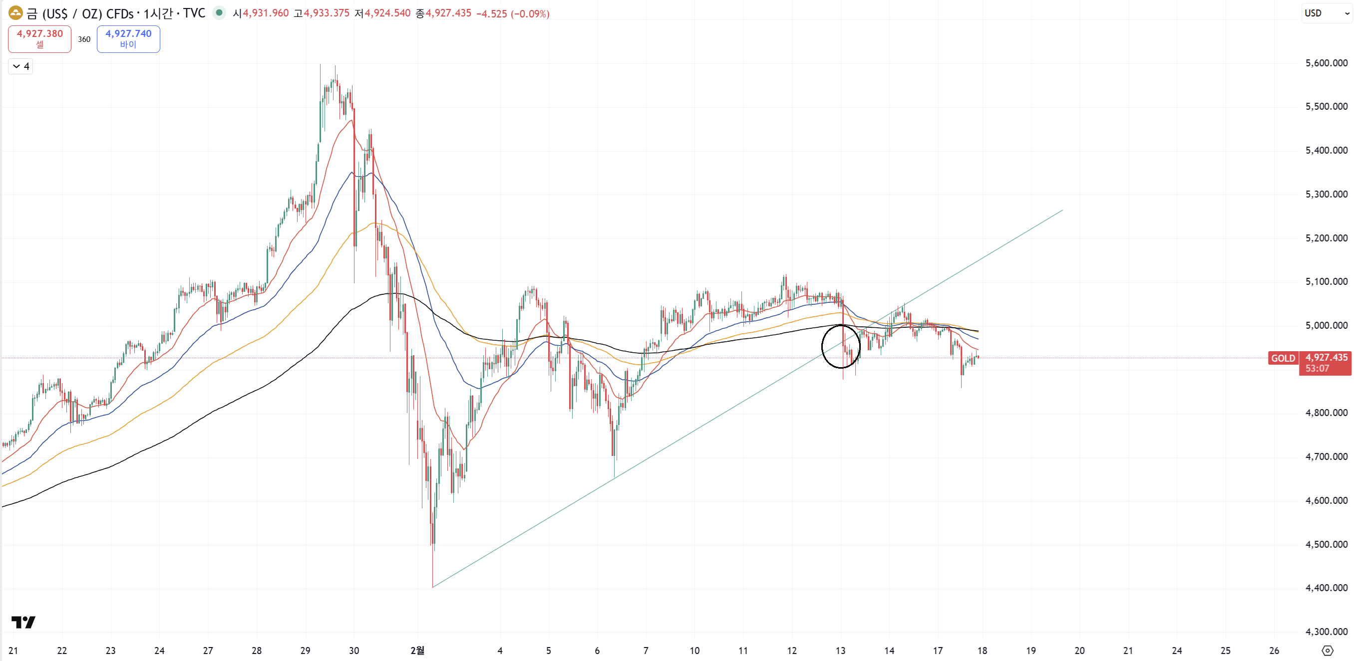 저 시간을 기점으로 골드는 상승추세선을 벗어나서 매도세 받기가 좋아졌습니다.