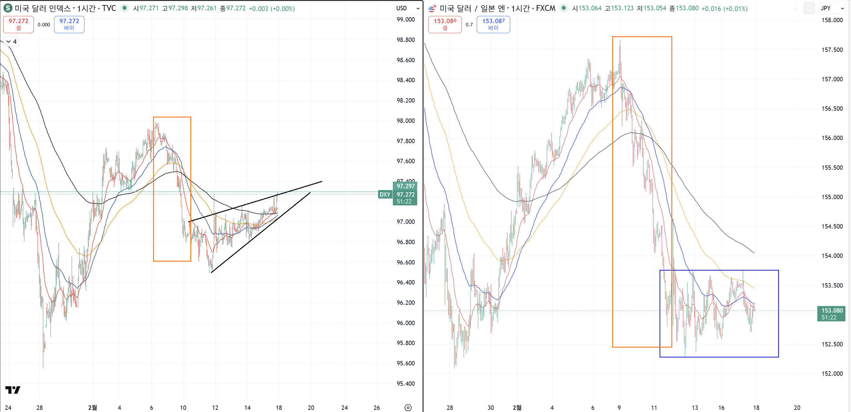 일단 주황색 구간에서 엔화 강세가 도드라지고