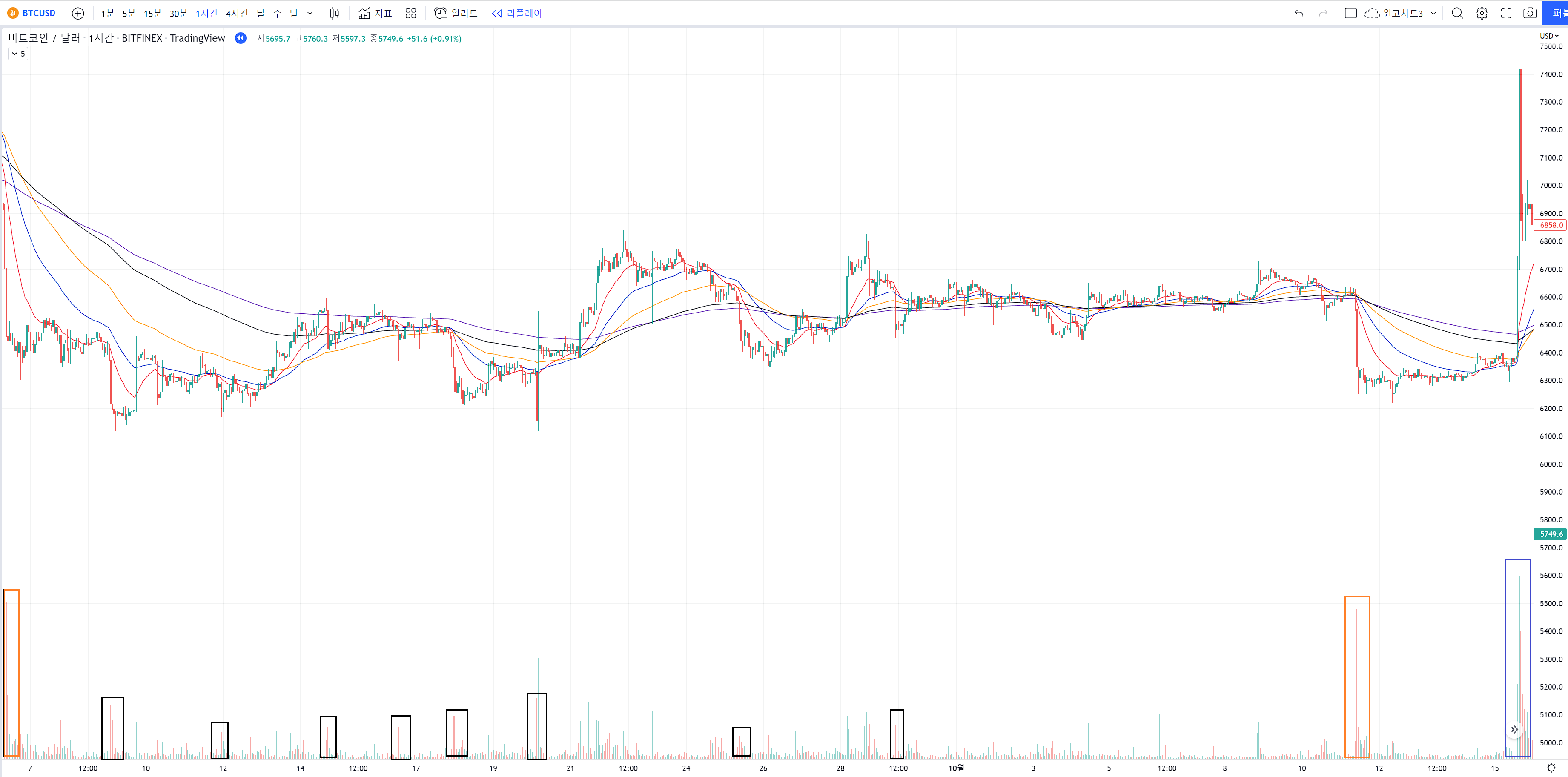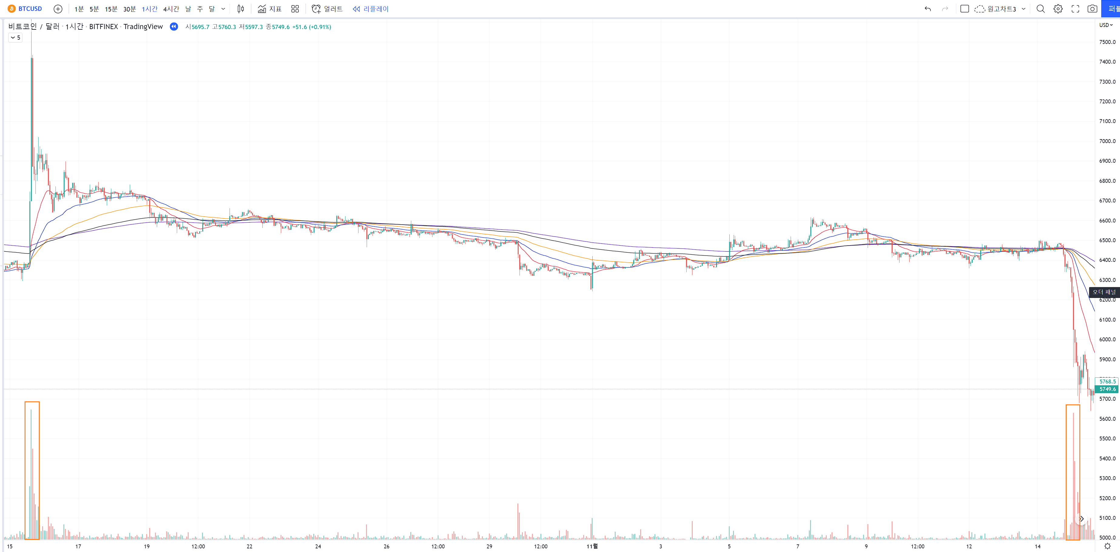 비트파이넥스쪽은 달라를 거래하는 현물차트이기때문에 거래량에 대한 신뢰가 높은편입니다.