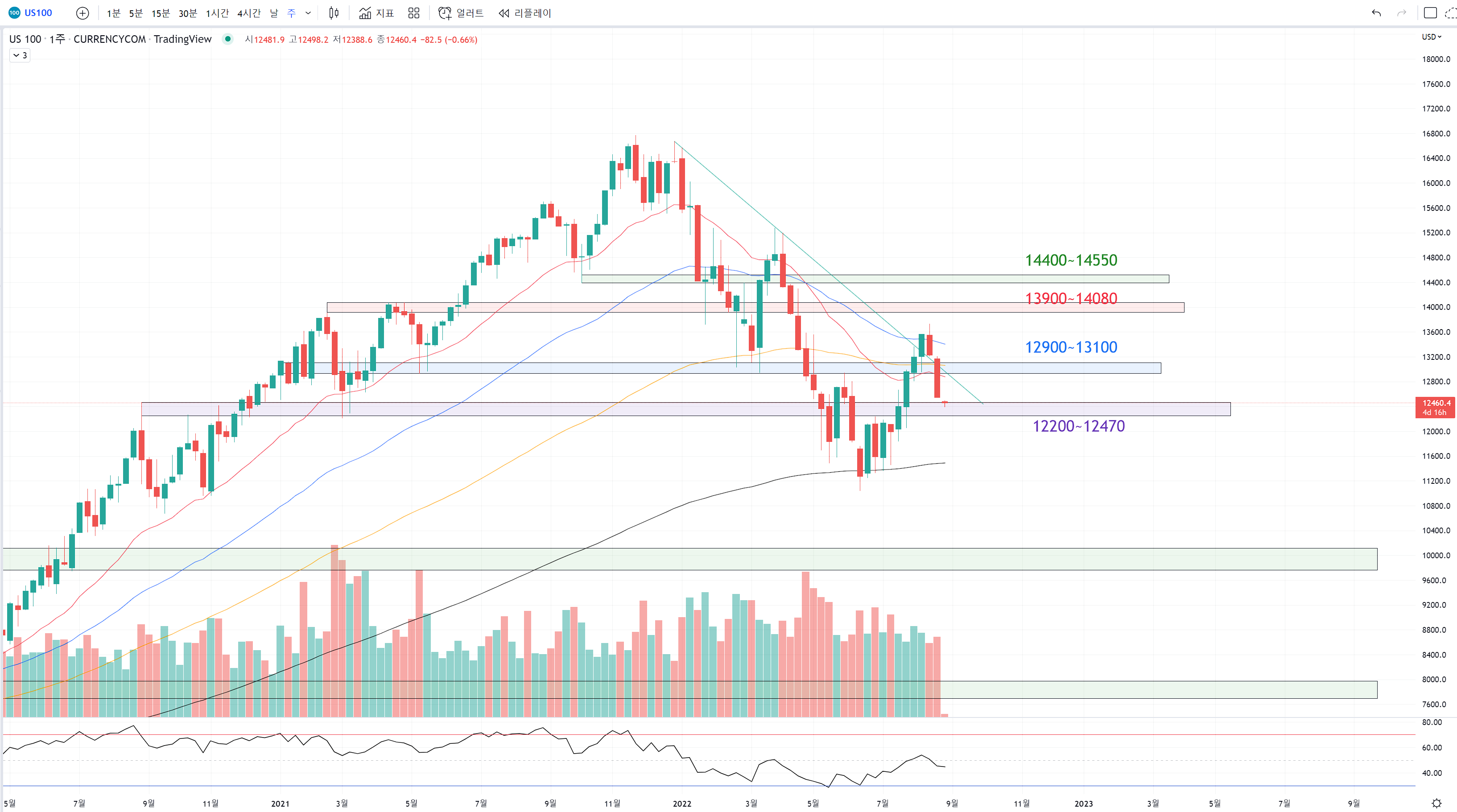나스닥이 반등해도 다시 추세선과 12900~13100 파랑색 저항구간을 넘기가 쉽지 않은 상황입니다.