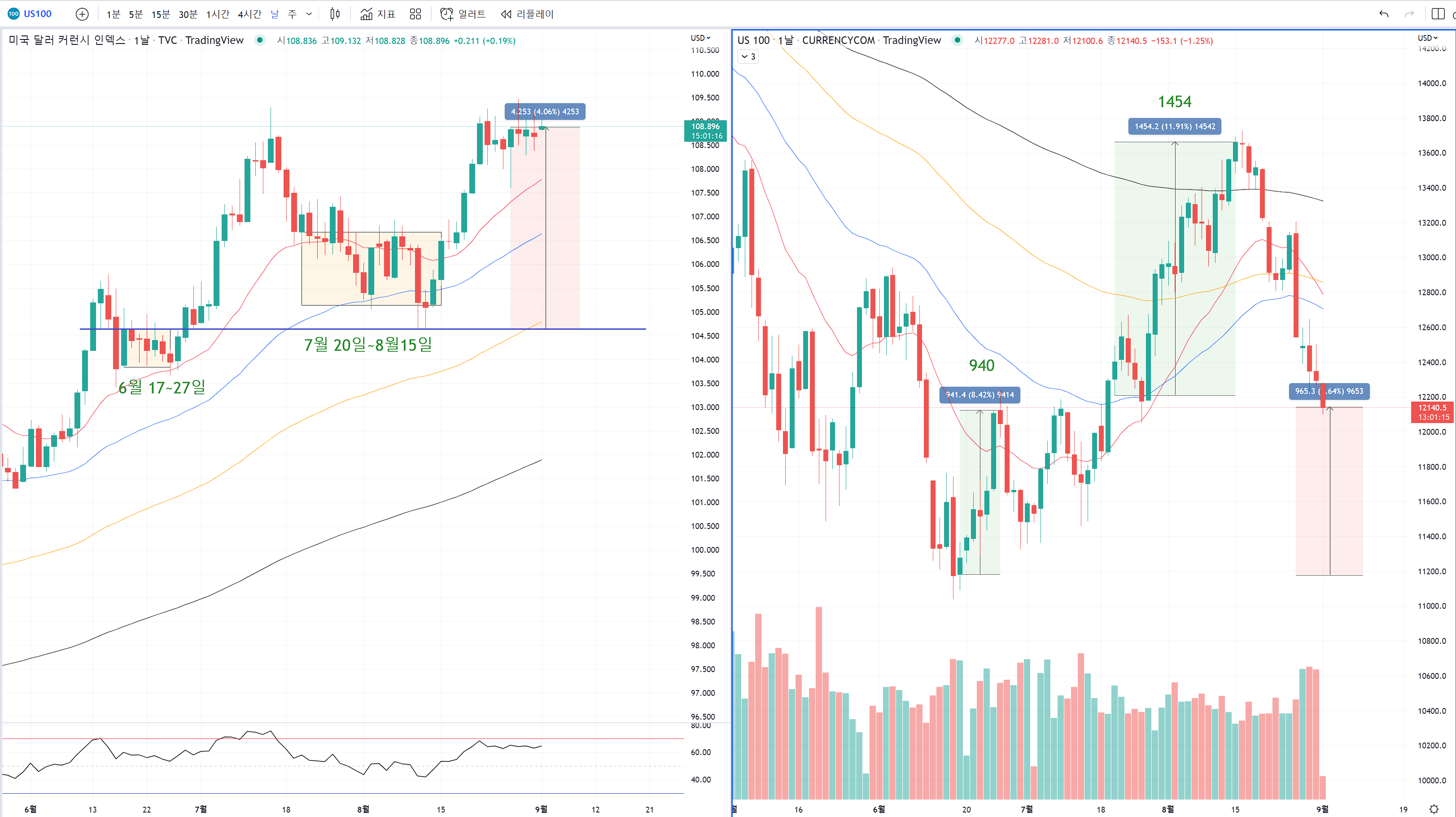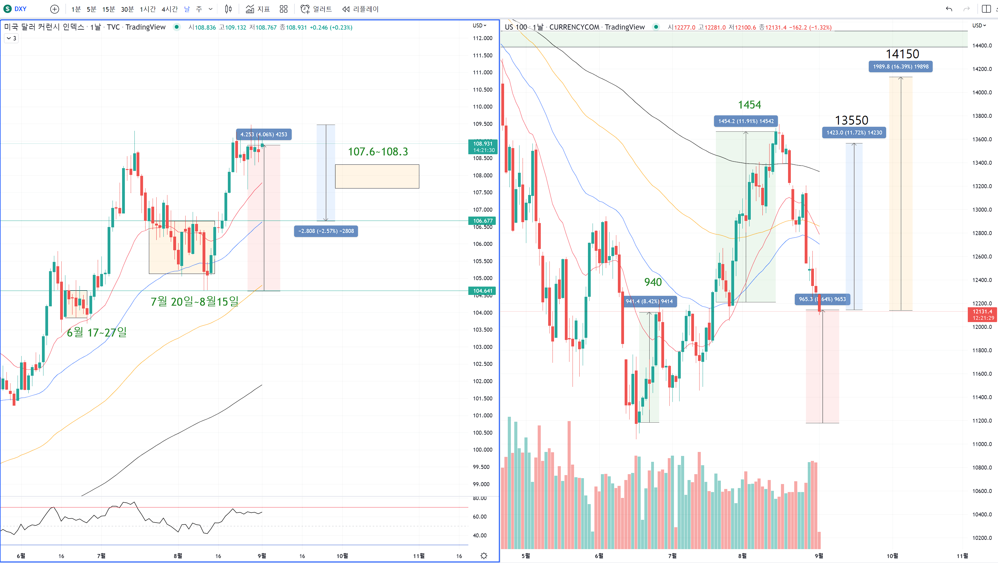 달라의 하락에서도 107.6~1083을 횡보할때 나스닥이 거품을 신나게 만들며 상승해줄 것을 기대할 수 있습니다.