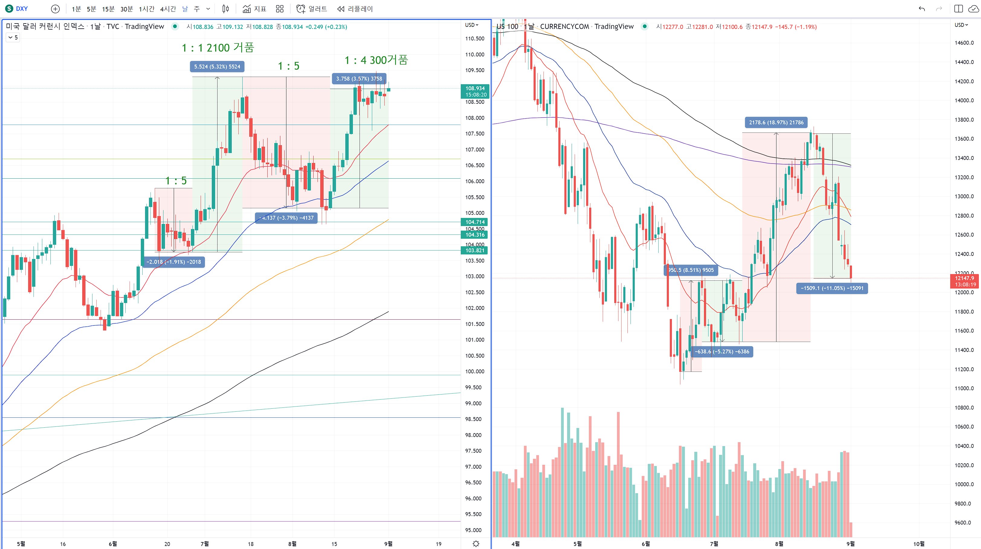 오늘 환율이 갭상승을 했을때 달라와의 상승을 교환비로 비교해보면