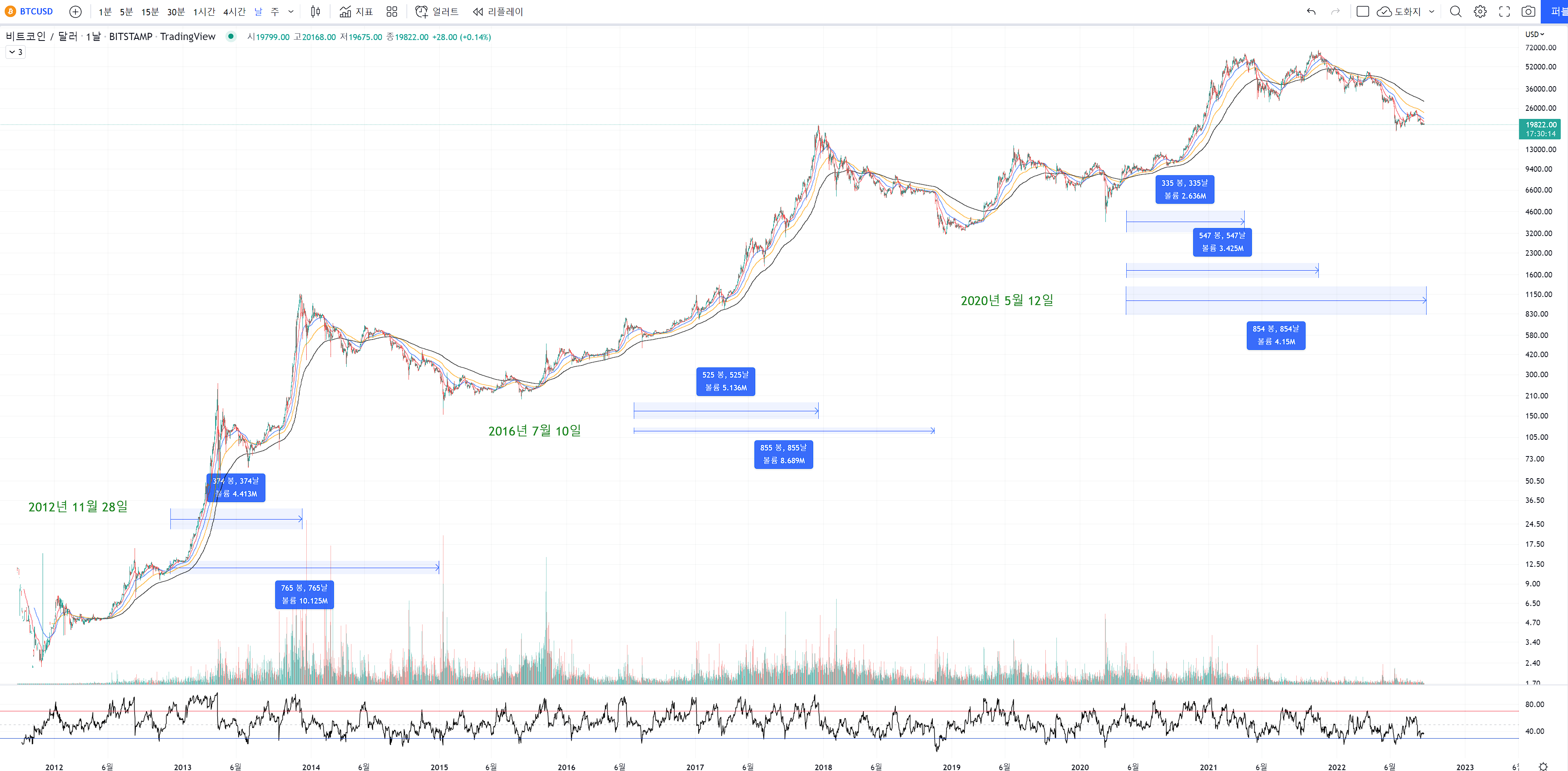 항상 같은 기간이 걸린다고 볼 수는 없지만 반감기 기준의 사이클은 참고 하기 좋기 때문에