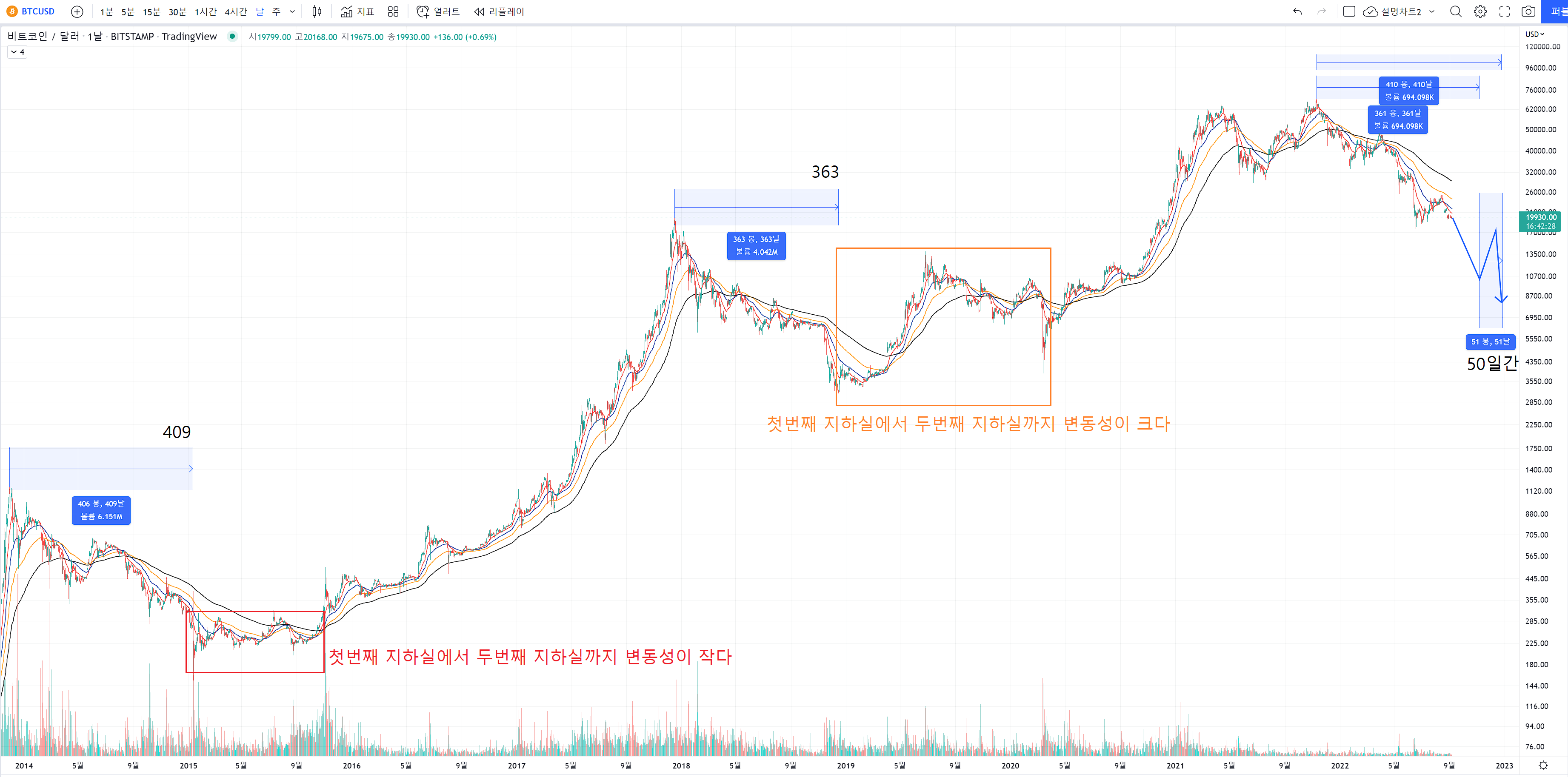 최고점 대비 지하실 가기까지의 기간이 50일정도 차이가 있어요.