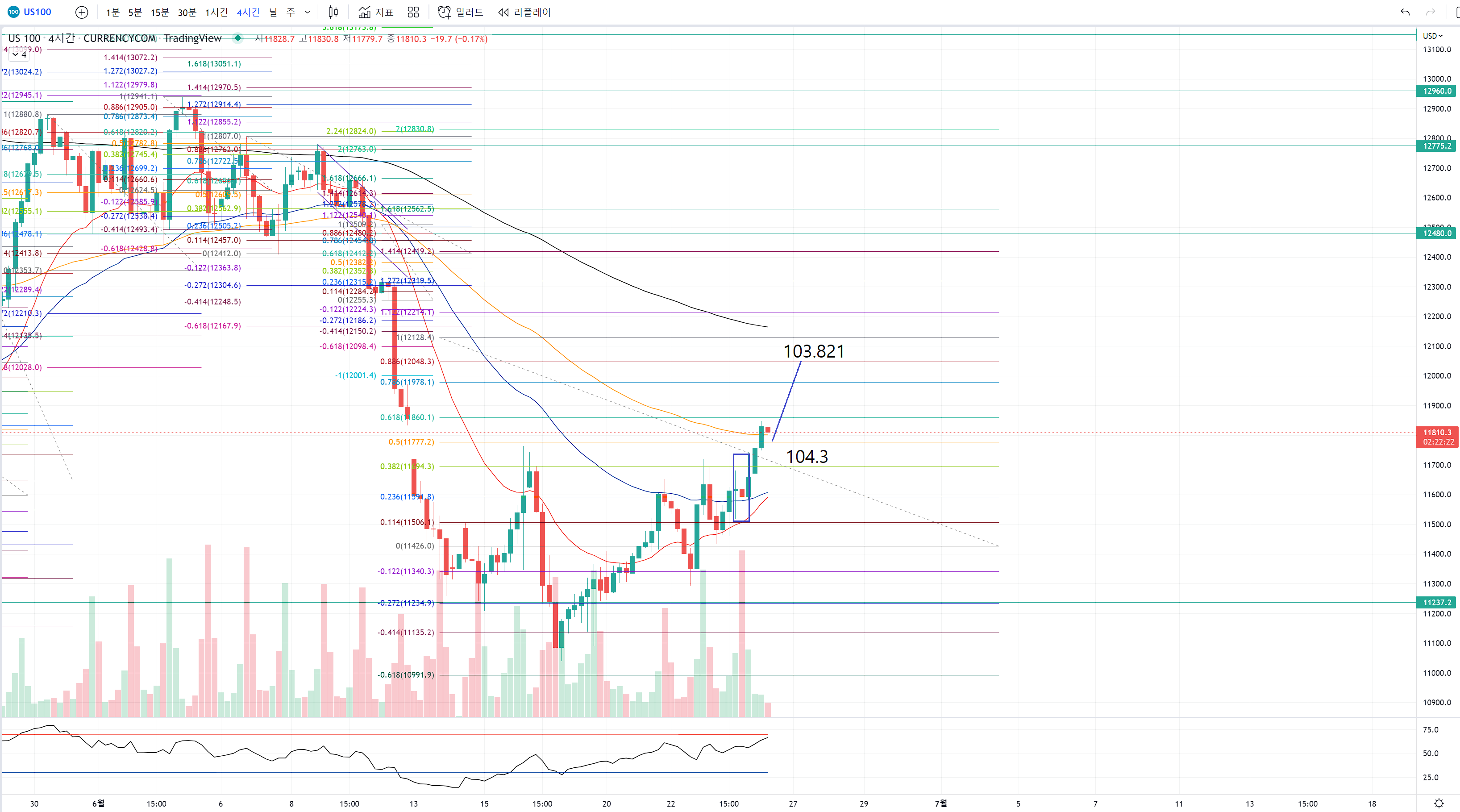 104.3을 확실히 막아주고 파랑색선 처럼 103.821이나 다시 도전하는게 제일 좋습니다.