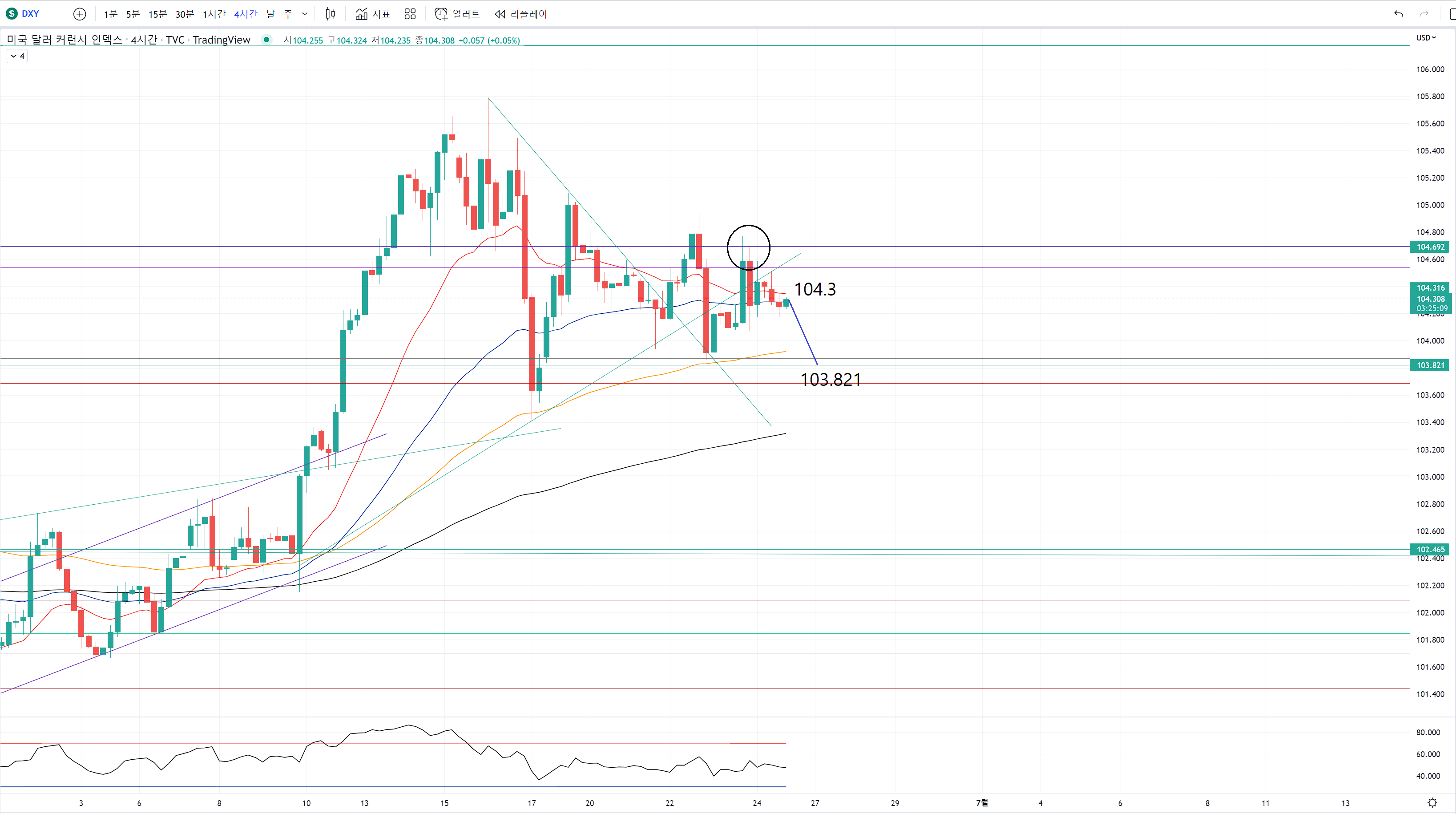 파랑색선 처럼 달라가 104.3을 막아주면서 103.821까지 내려올때
