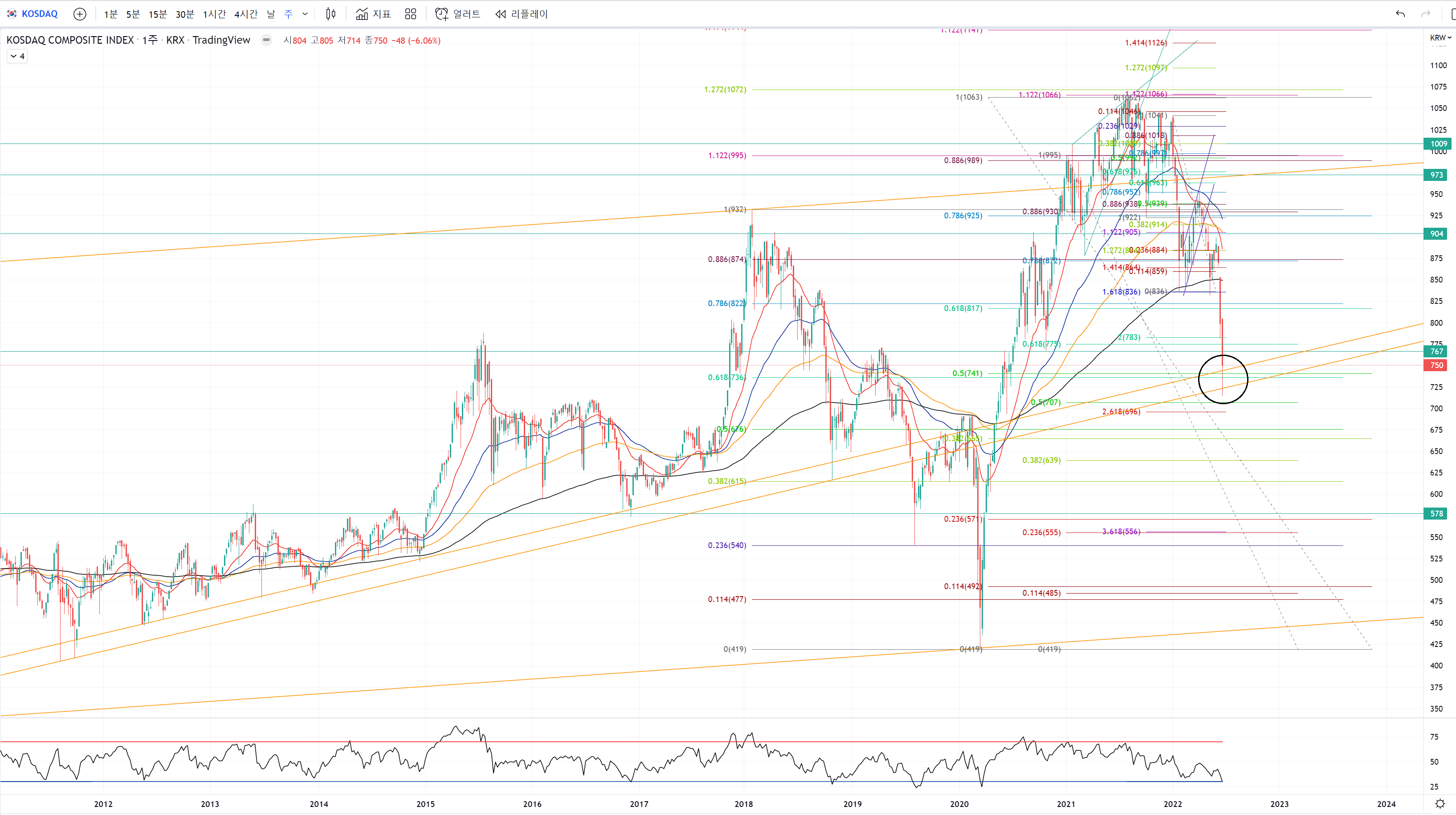 코스닥의 경우 저번 비트코인처럼 평행채널 스러운 꼬리들 모은 상승추세선 2개가 있습니다.