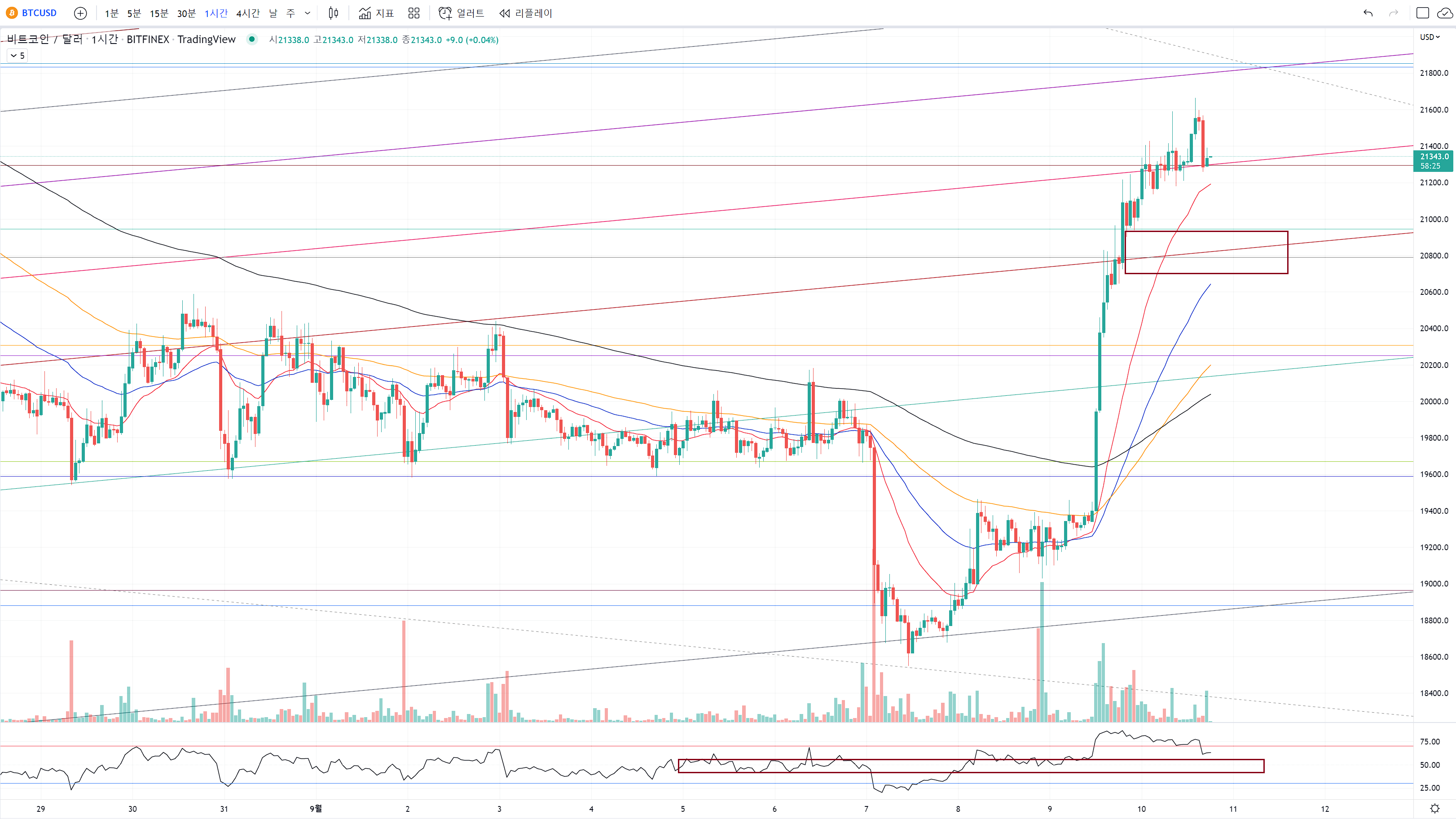 검은색 동그라미로 표시한 21900 약간 위의 고점을 갱신해주는 모습도 필요한데