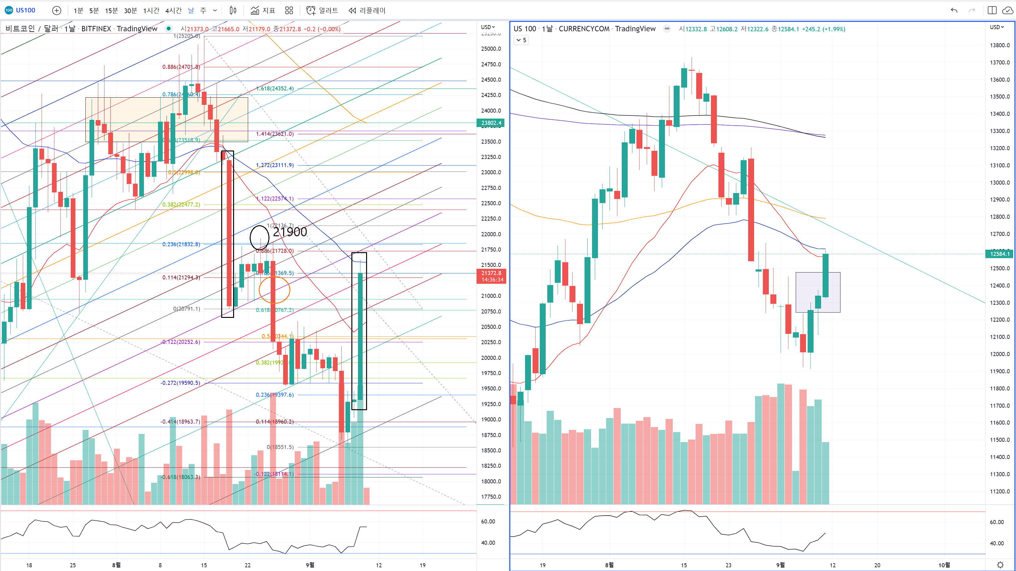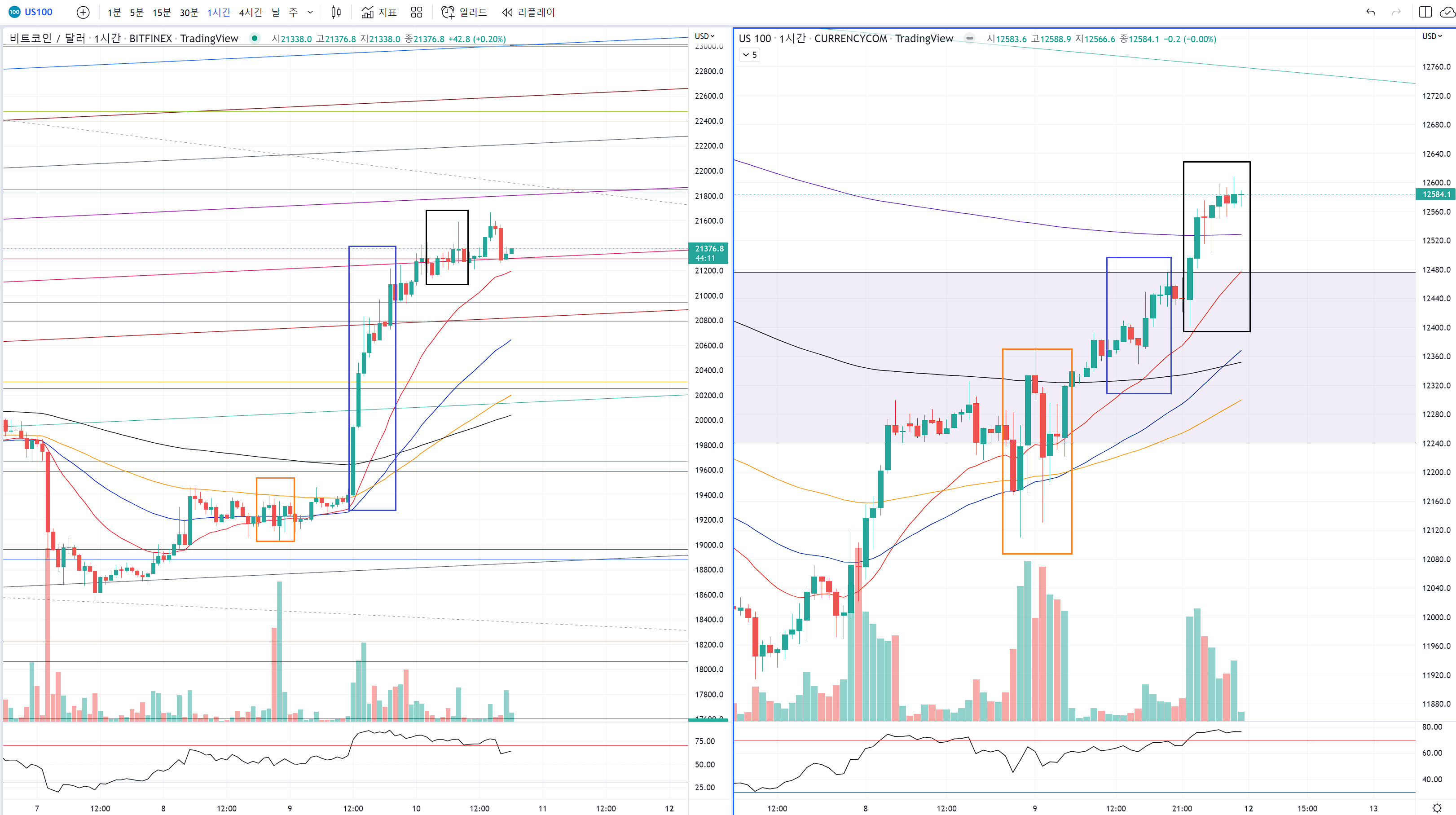 왼쪽은 비트코인 차트이고, 오른쪽은 나스닥 차트입니다.