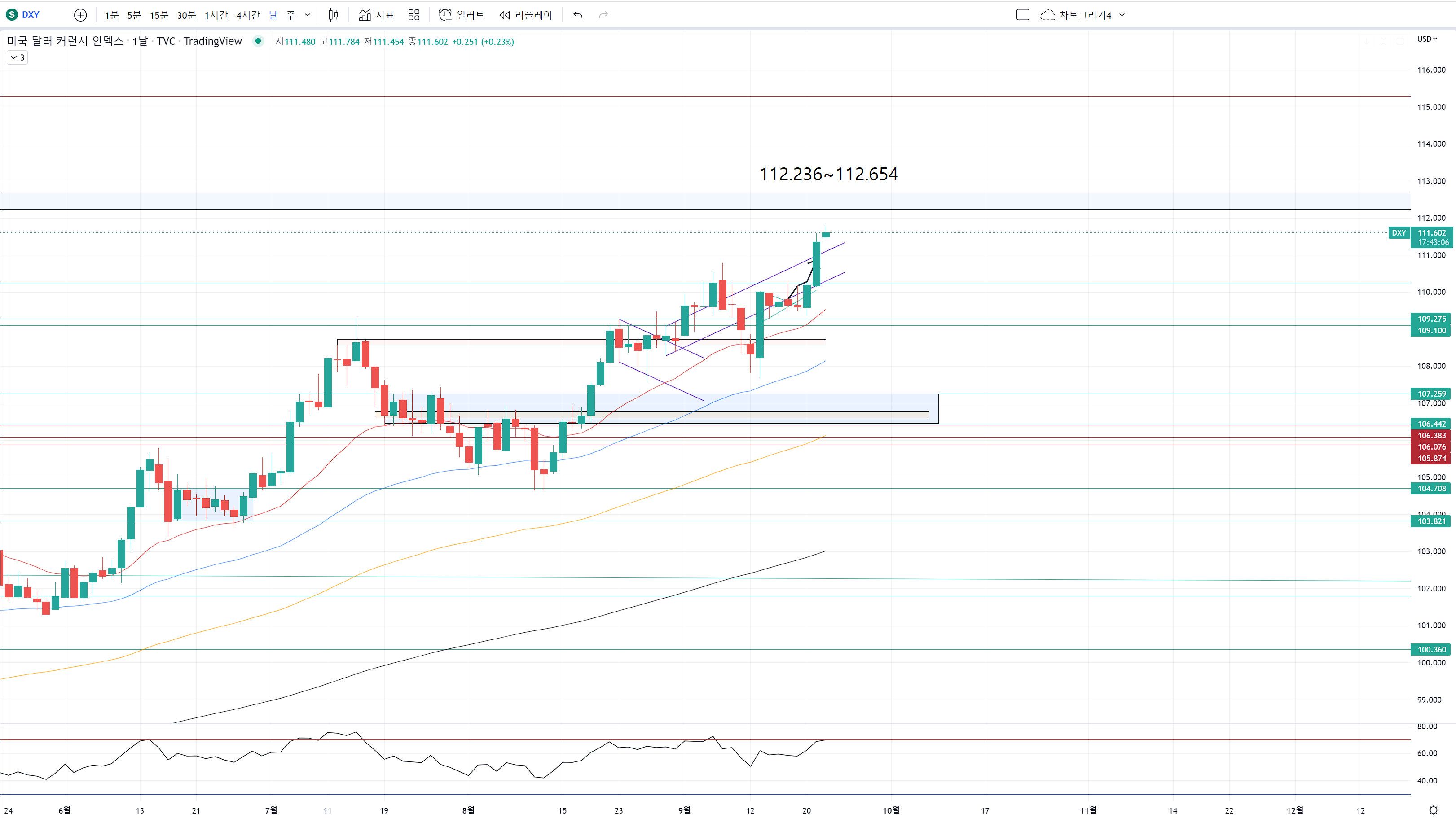 그리고 그 조정이 110.245까지 내려올때 나스닥이 보라색 구간이나 추세선까지라도 온다면