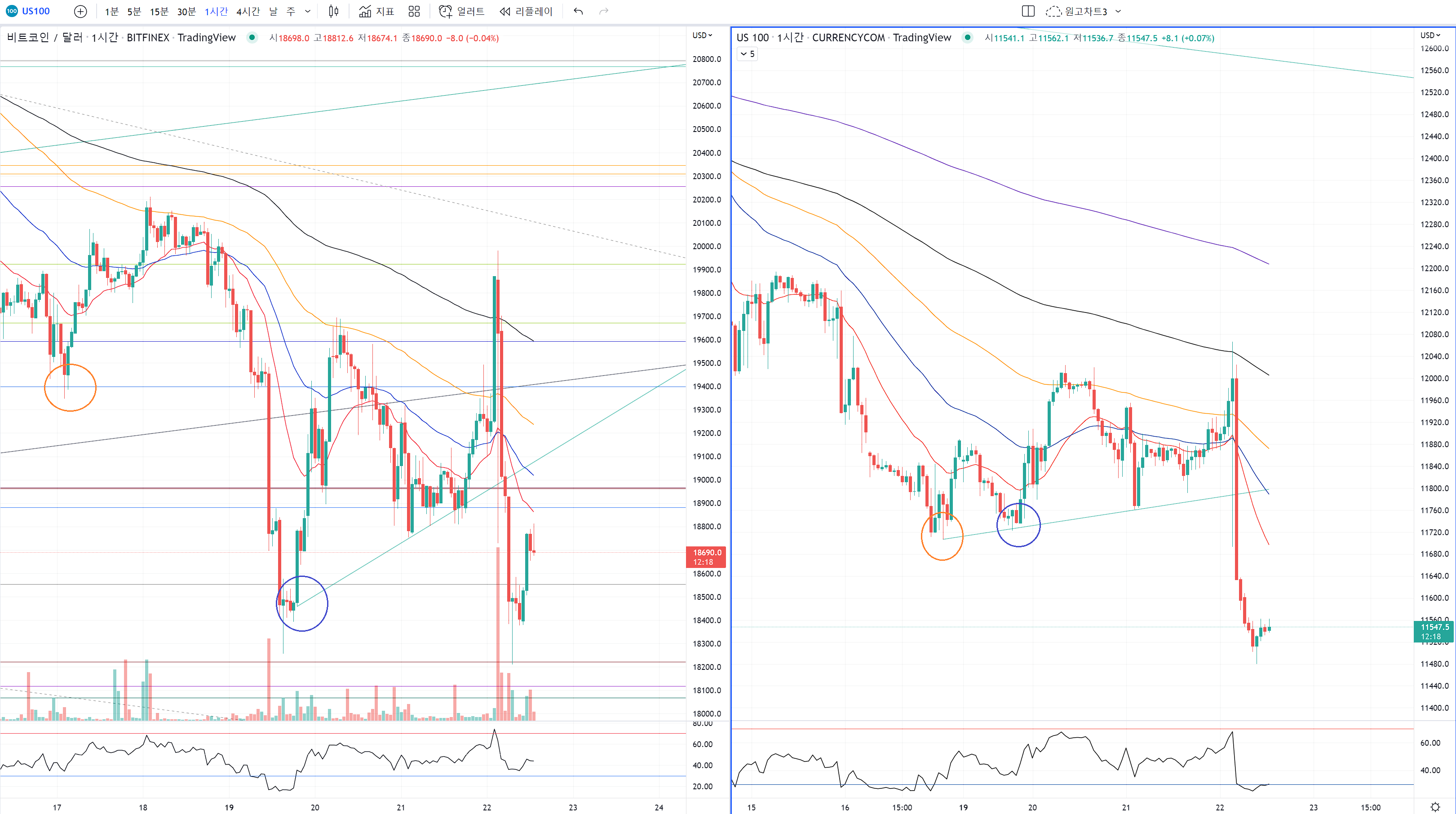 나스닥의 지금 위치와 비트코인의 지금 위치는 비슷한 하락률을 보입니다.