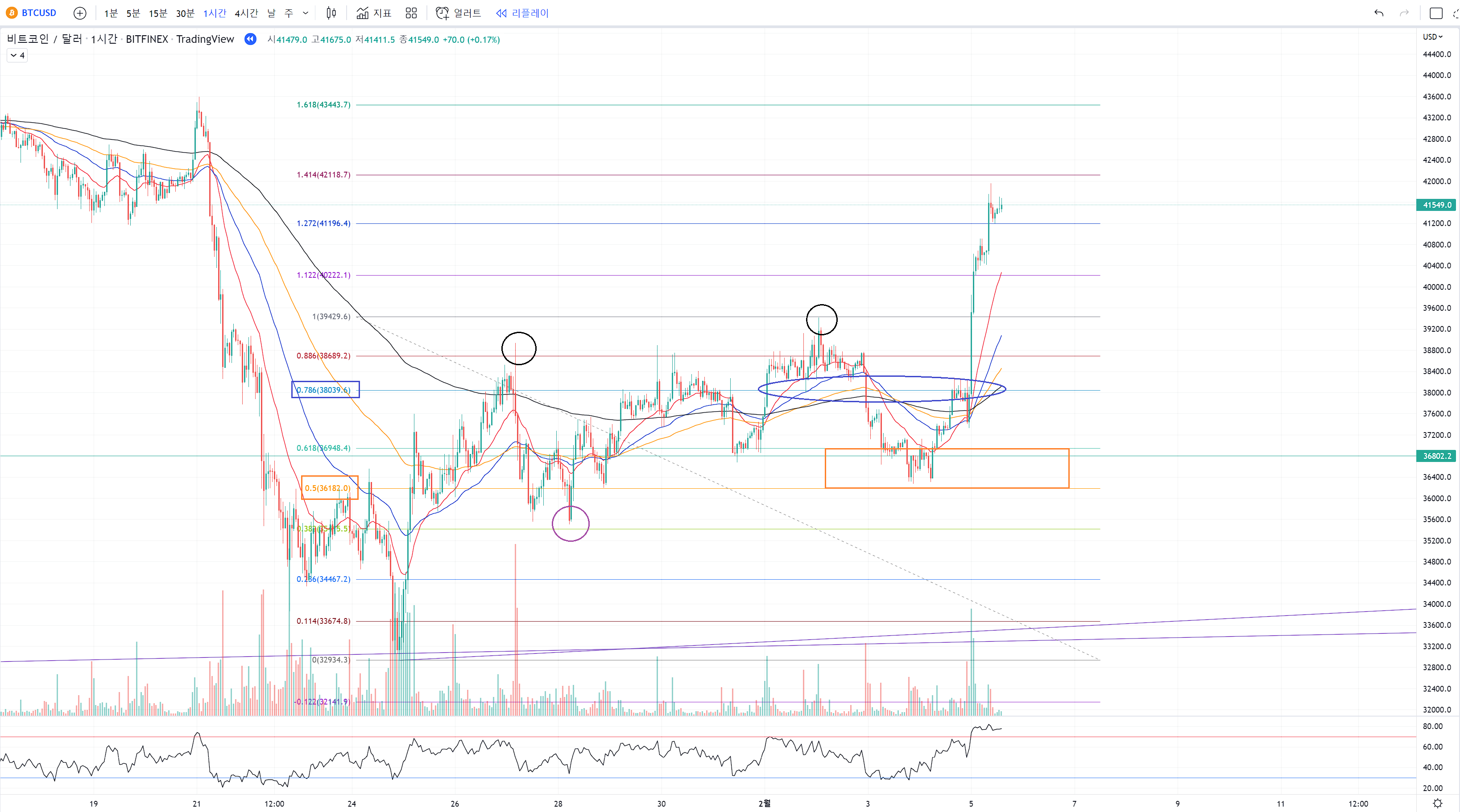 비트코인은 여전히 1시간봉 기준에서 rsi 과매수나 과매도 터치가 없습니다.