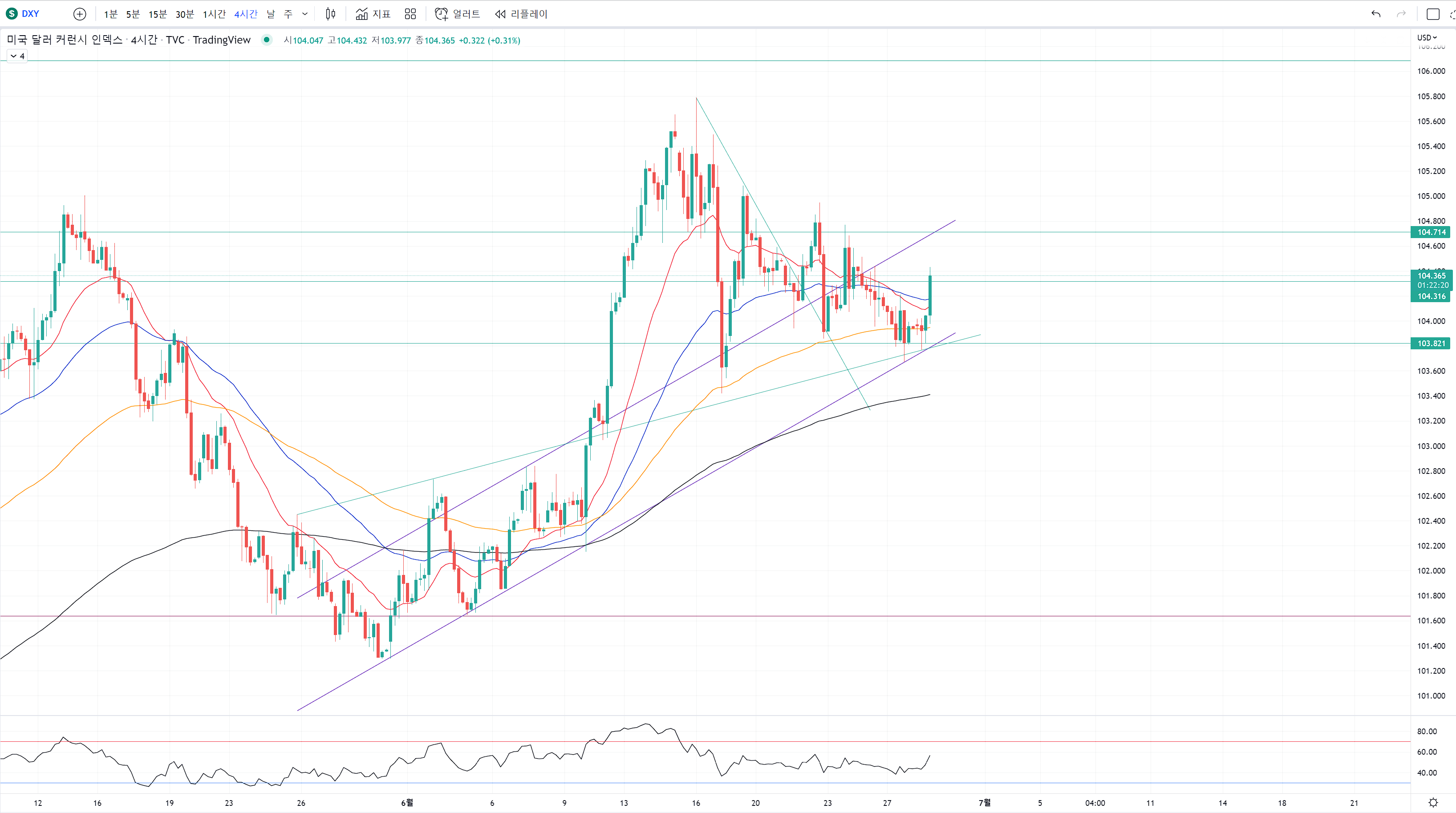 아마 달라가 죽지않고 다시 104.7을 확인한다던가 넘어간다던가 하는 상황이 되면