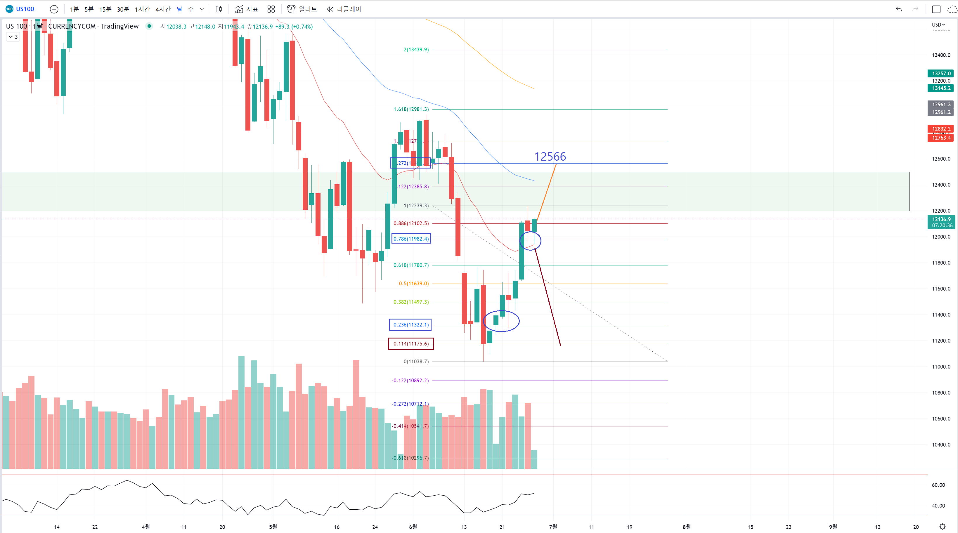 피보나치 비율상 0.786도 의미가 있지만 파랑색 동그라미들로 인해