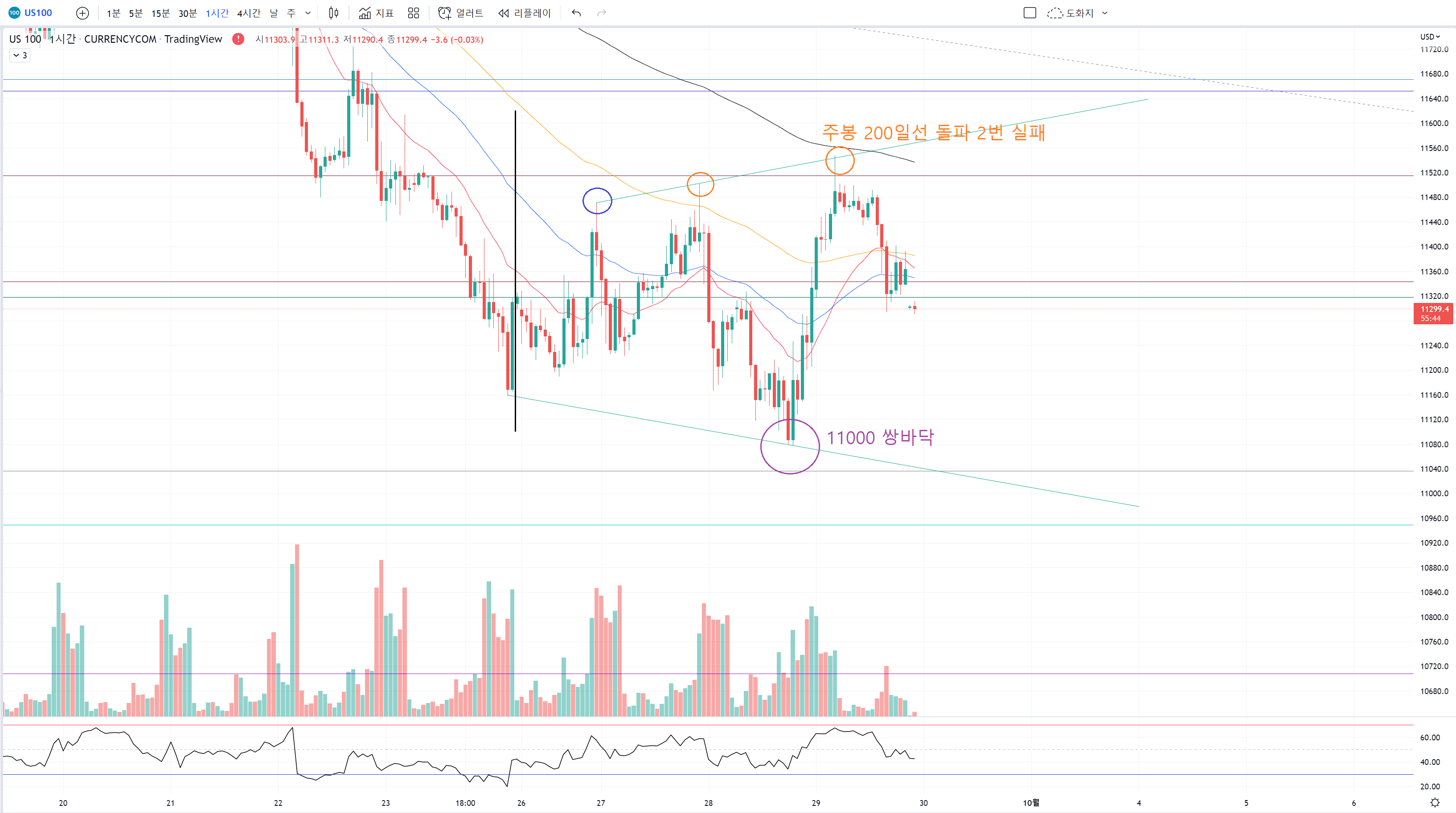 이 경우에 나스닥이 흘러내리면 쌍바닥 반등 실패에 3번째 11000 인식 때문에