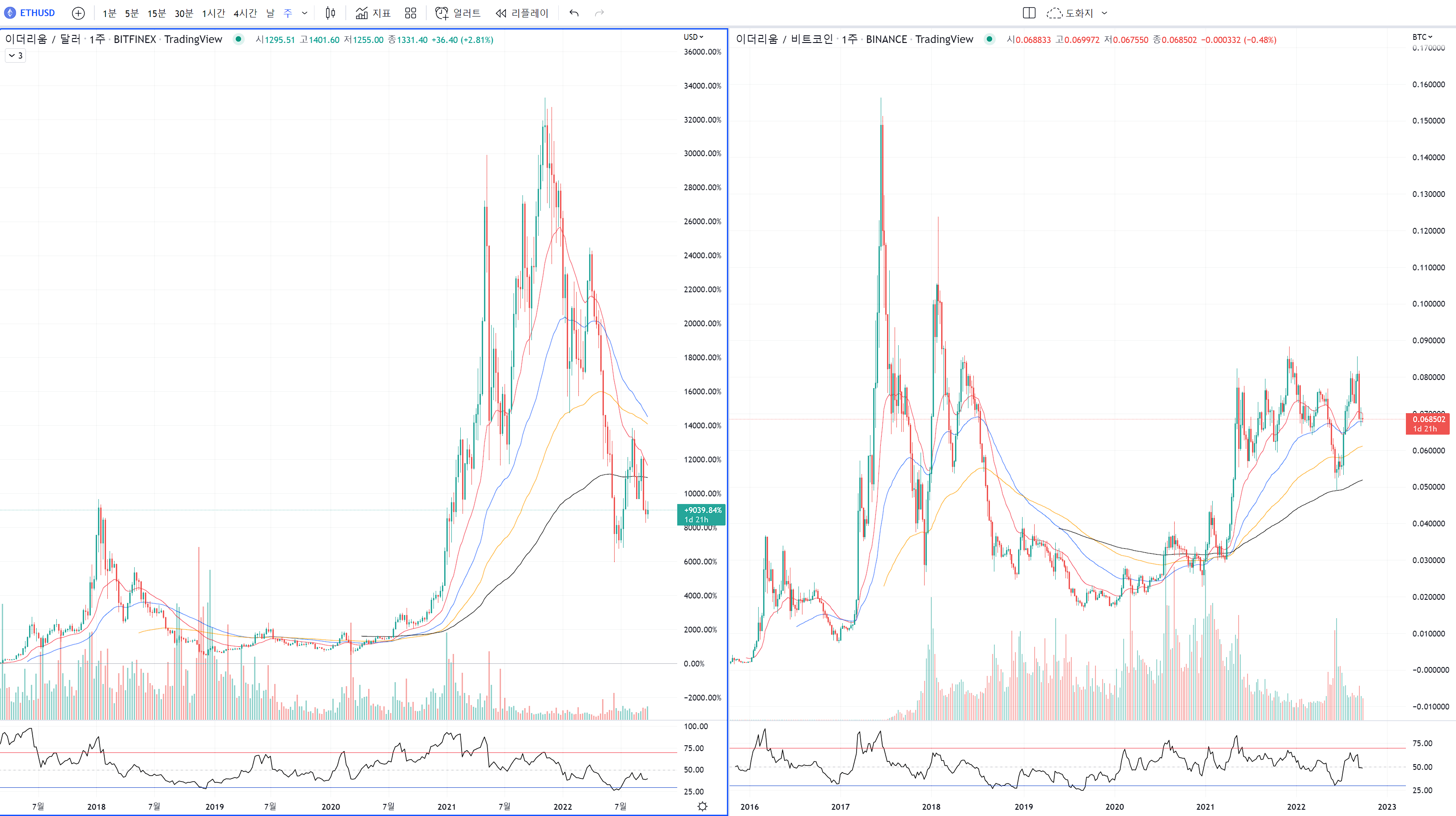 왼쪽은 비트코인 달라 차트이고, 오른쪽은 이더리움 btc 차트입니다.
