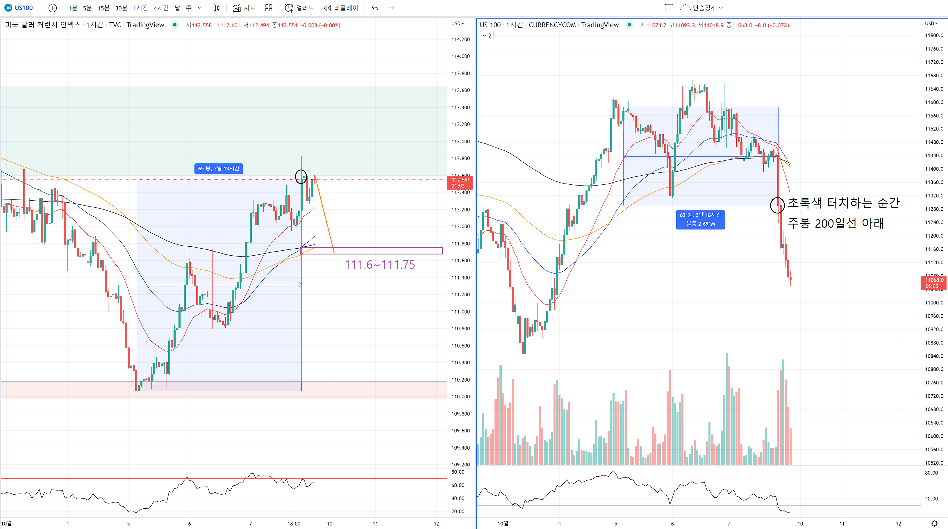 왼쪽 달라 차트는 검은색 동그라미에서 초록색 구간 터치를 했습니다.
