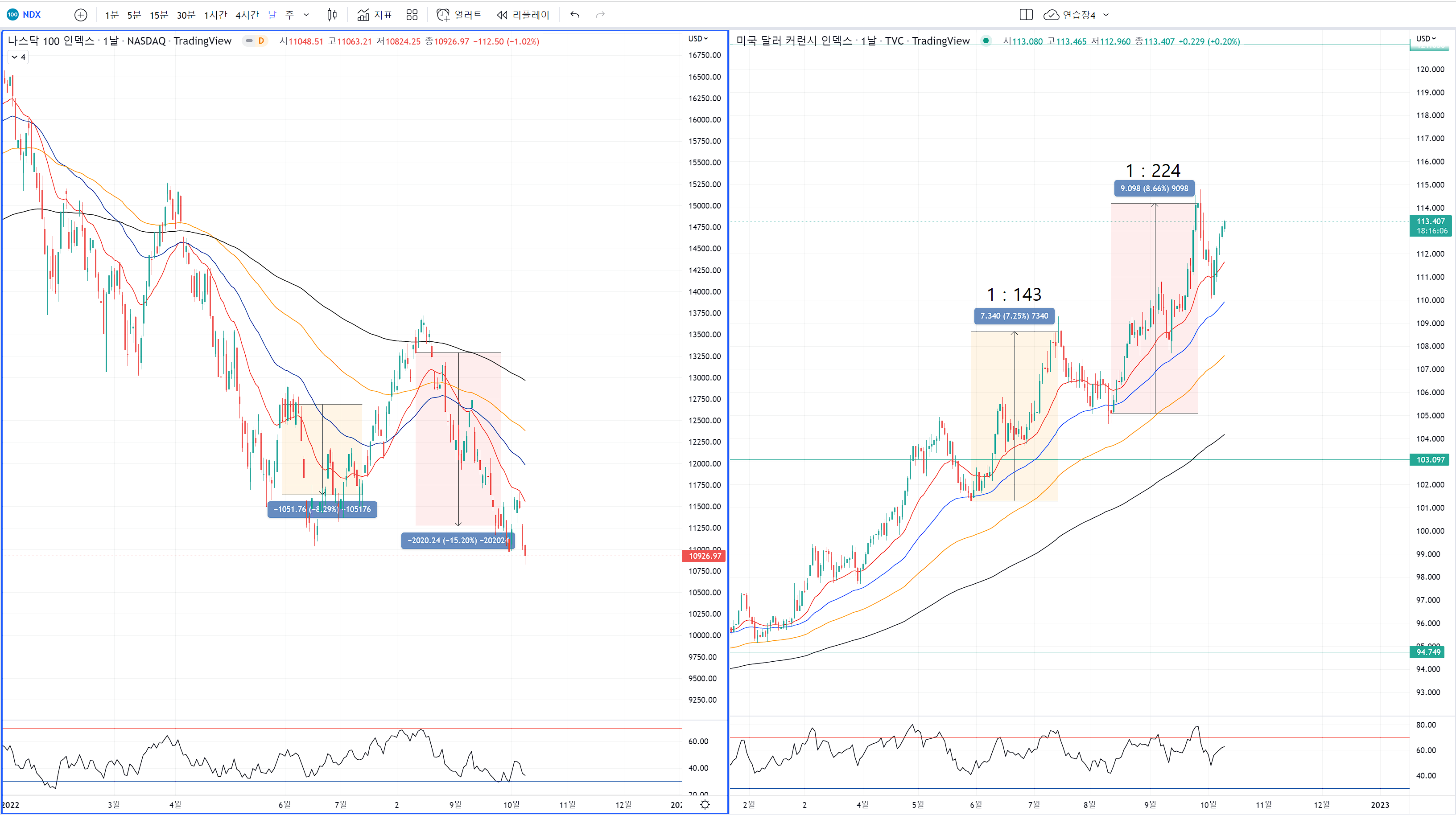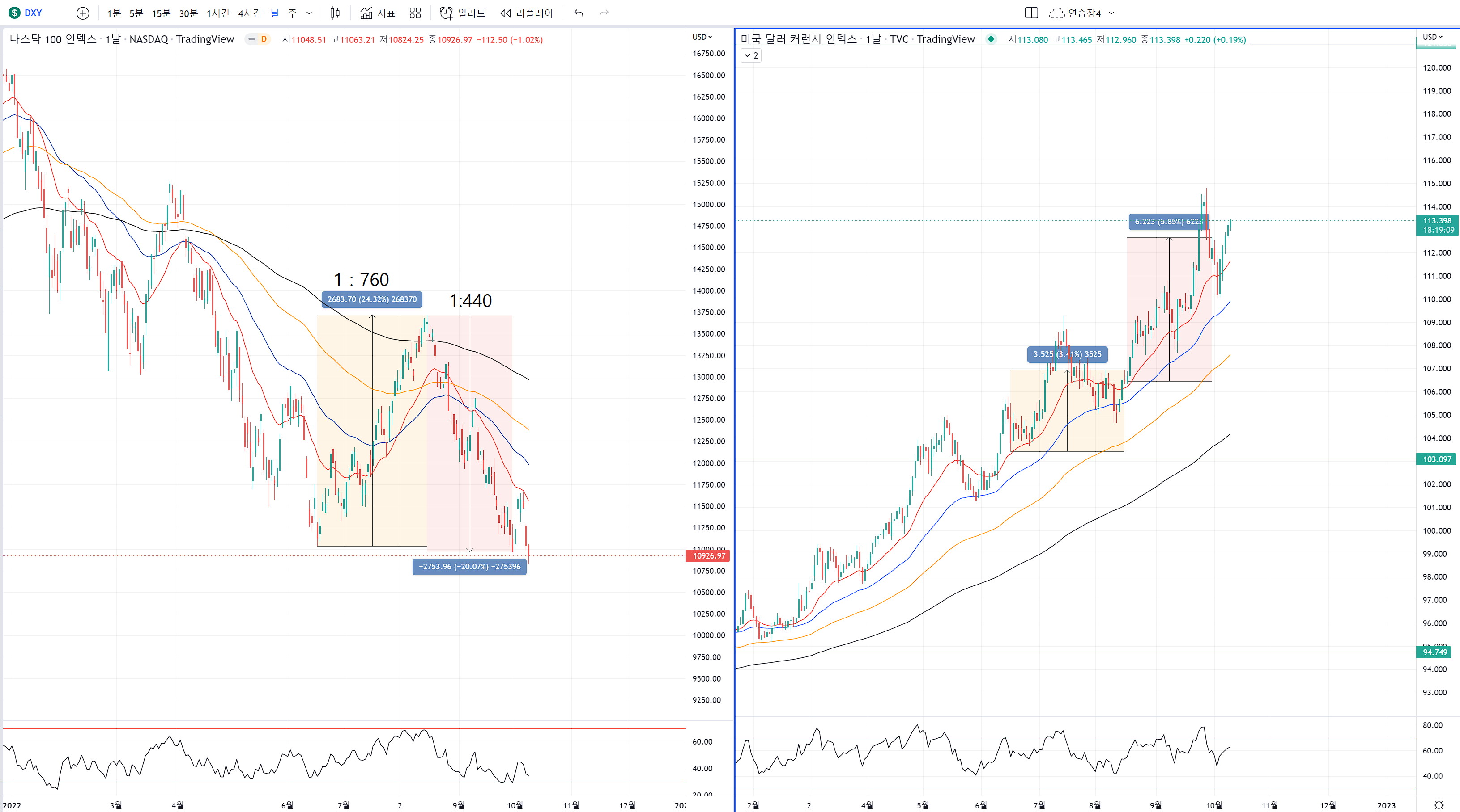 위에서는 나스닥의 움직임을 기준으로 했다면 이번에는 달라를 기준으로 했습니다.