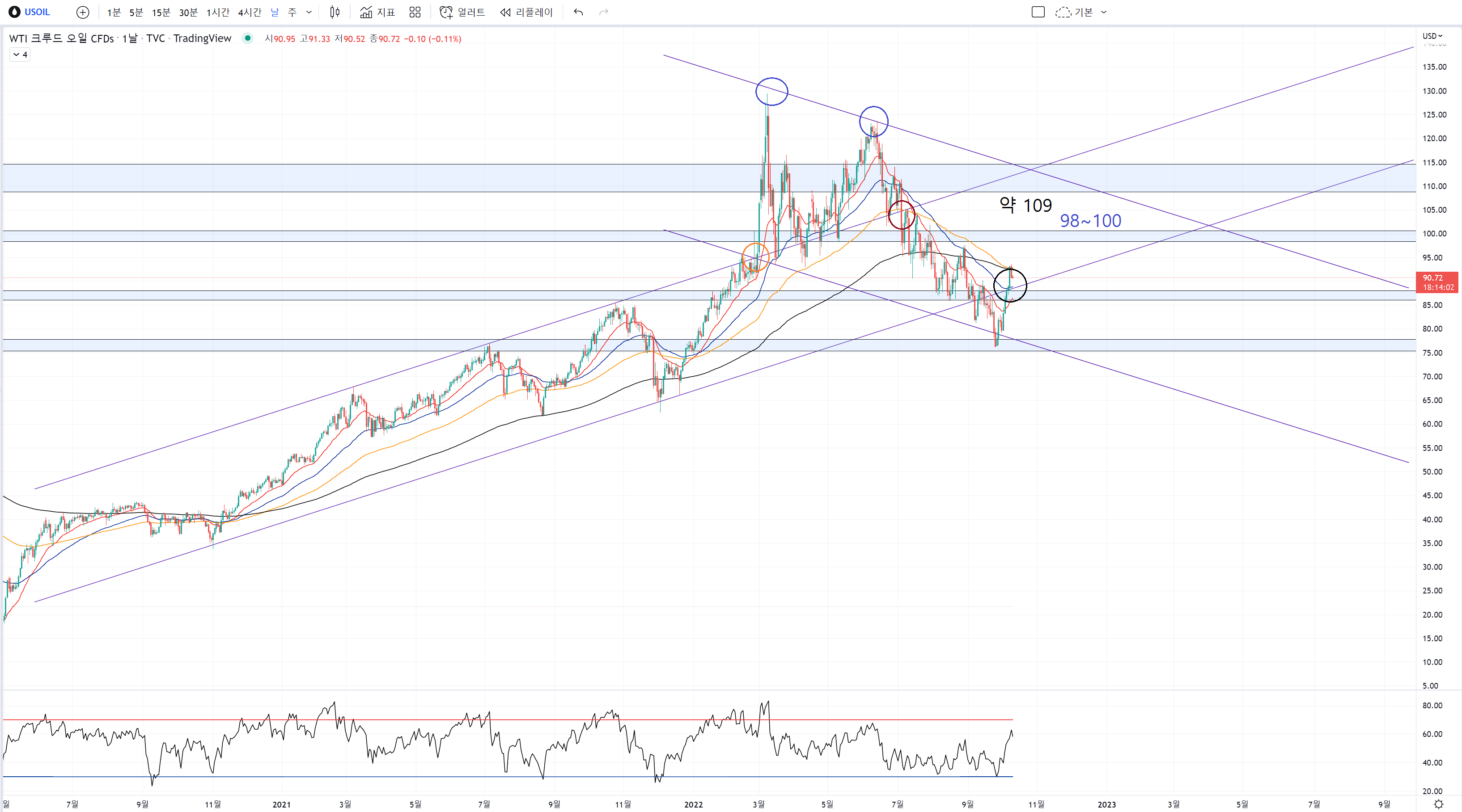 현재 오일 차트는 고점을 낮춘 상태에서 저점을 낮추지 못해 하락장 확정을 못 짓고 있습니다.