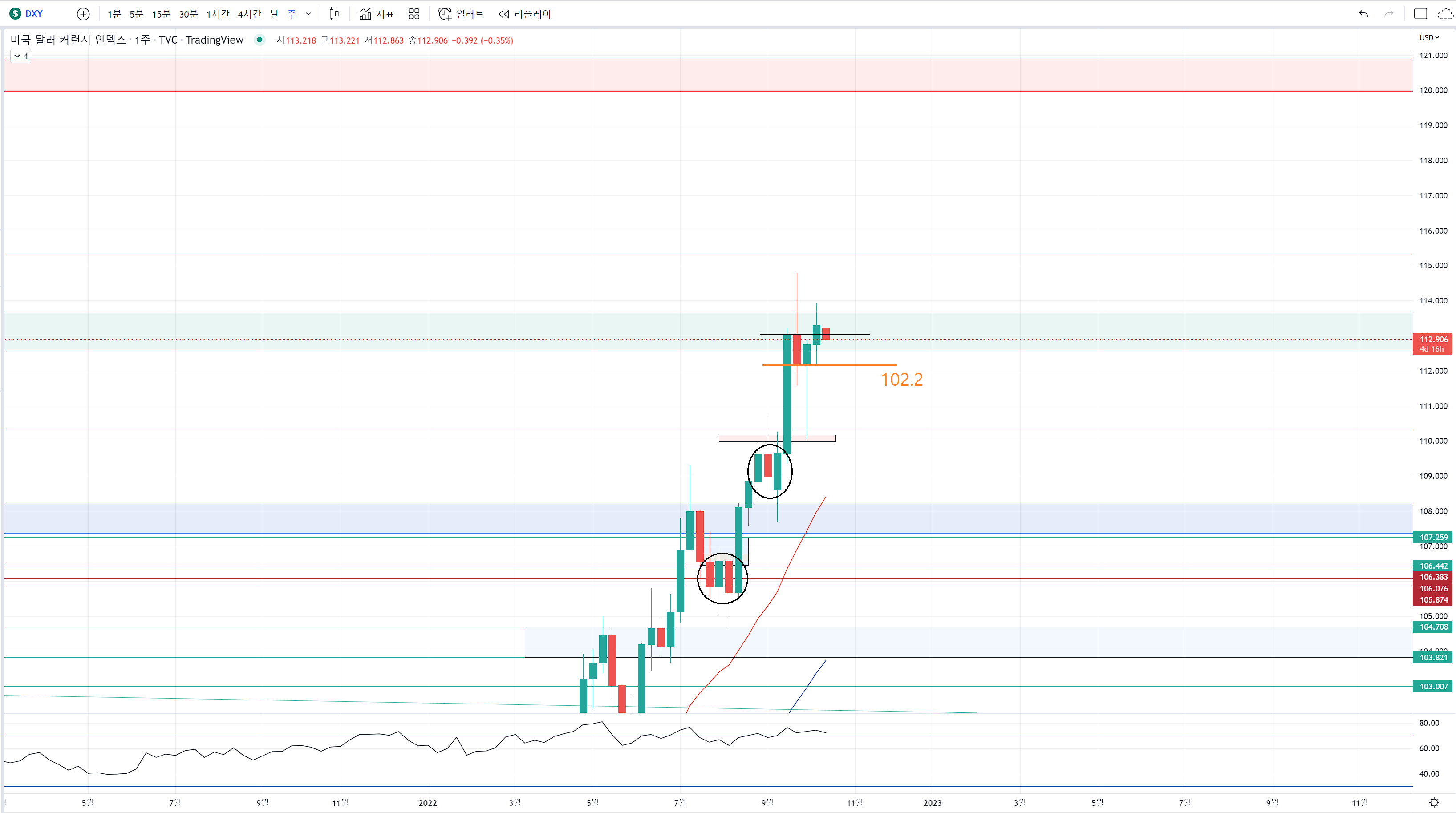 이번주에 102.2 아래까지 밀어내면서 주봉 마무리를 해줘야 합니다.