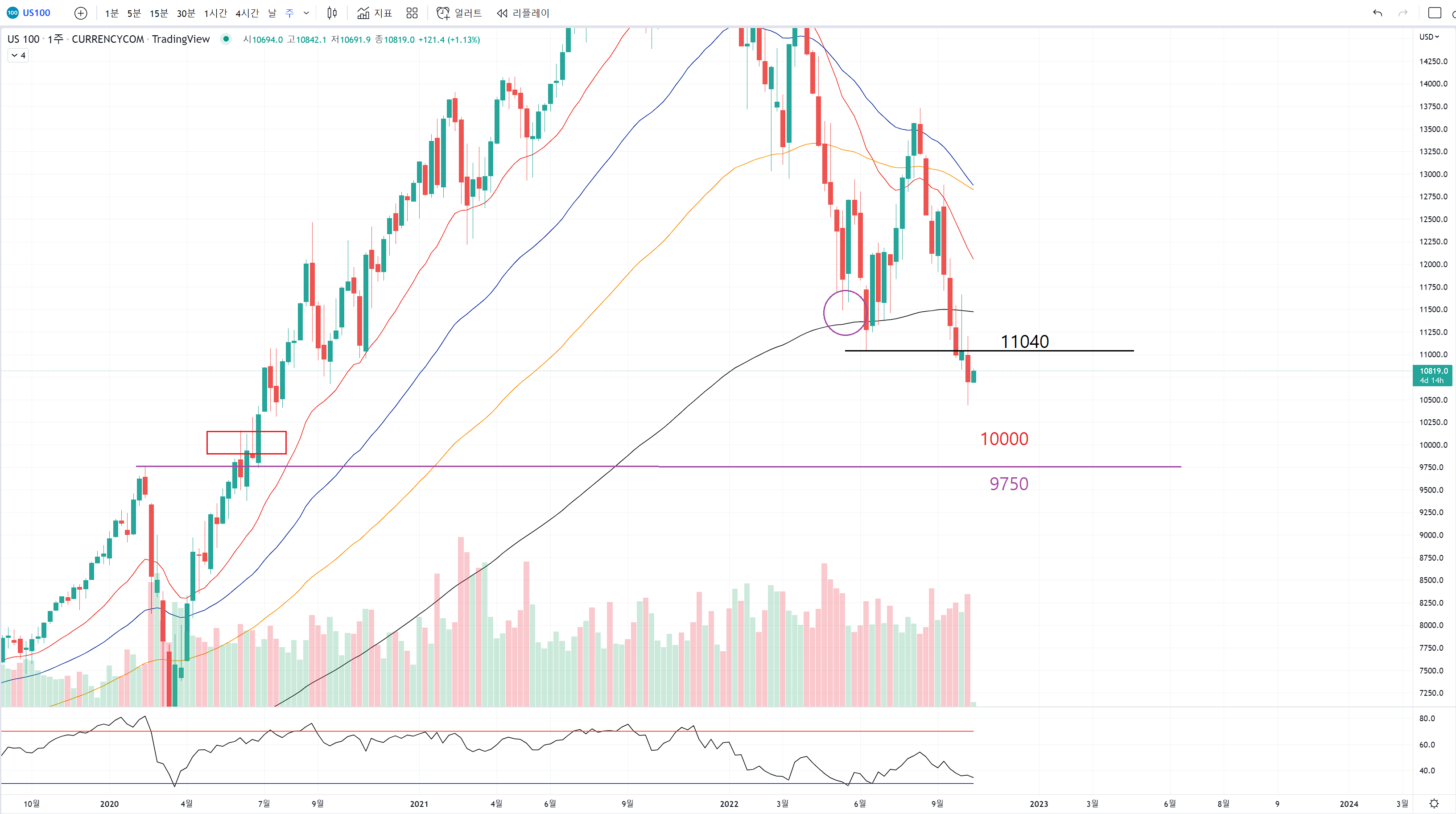지난주 나스닥 주봉은 주봉 200일선은 커녕 전저점인 11040도 넘어가지 못했어요.