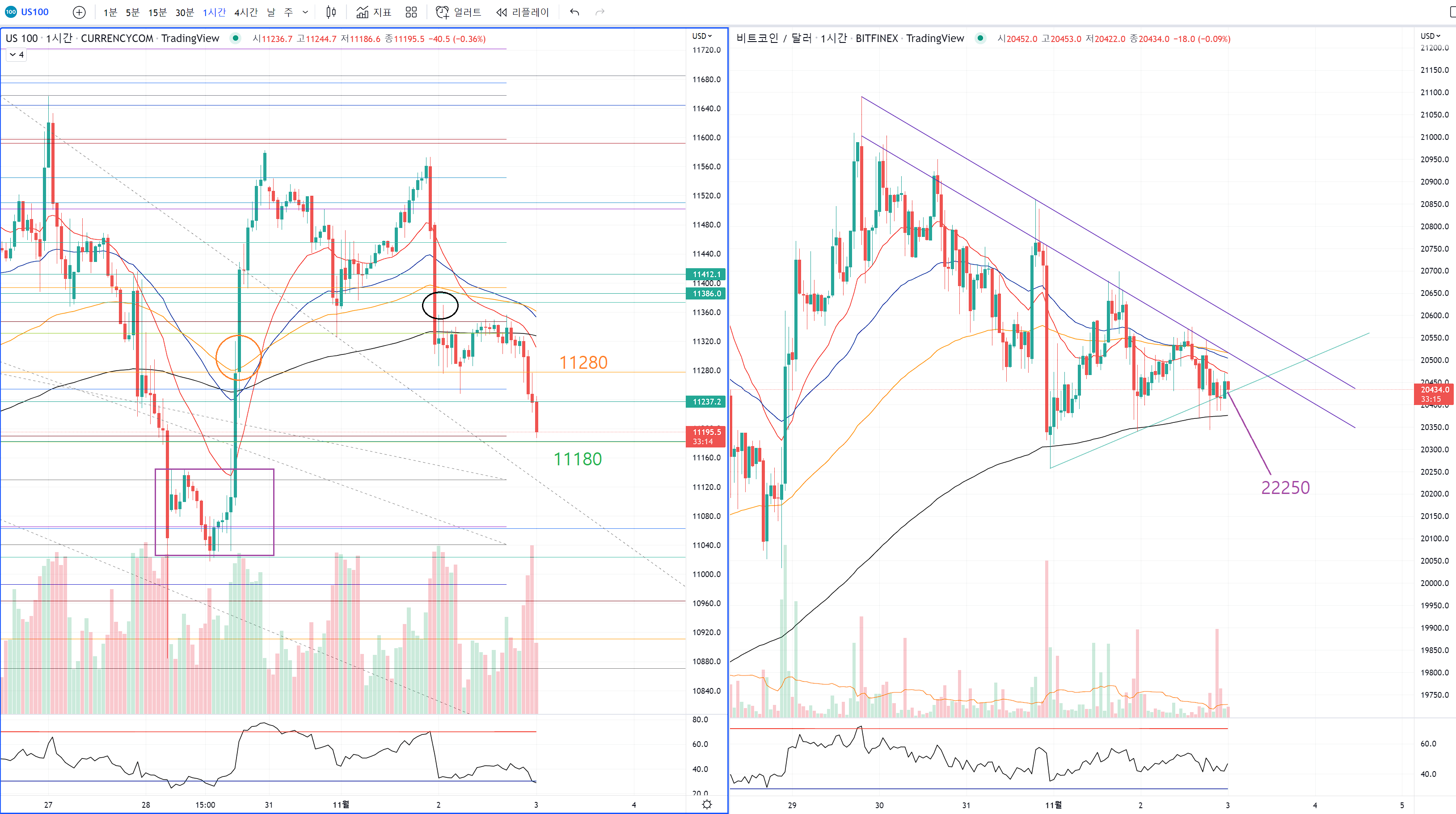 오른쪽 비트코인을 보면 나스닥이 흐르는 것에 비하면 20400을 계속 지켜주고 있습니다.