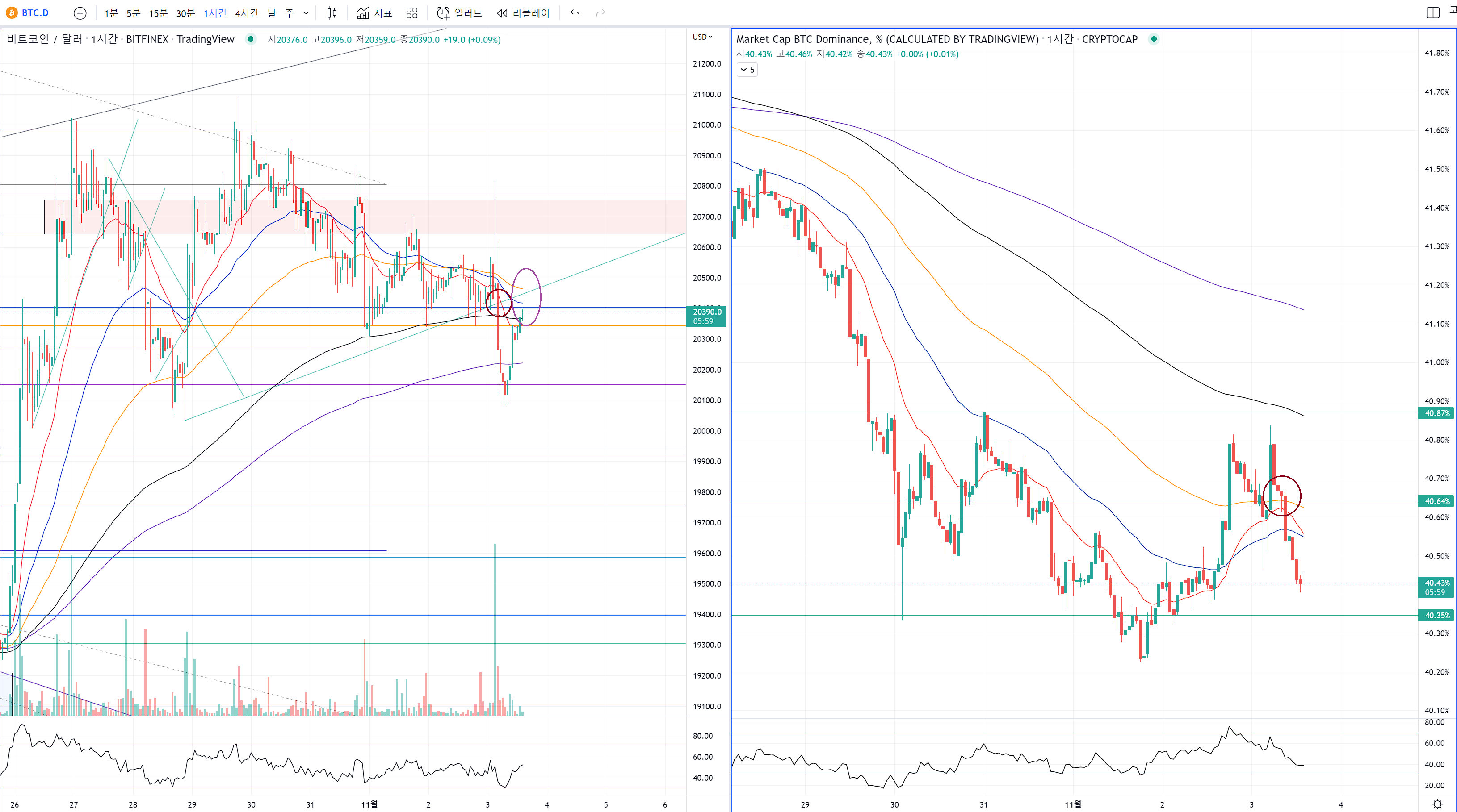 물론 이건 도미넌스의 모습도 같이 봐야해요. 기왕이면 도미넌스도 같이 상승하되 40.86은 넘지 않는 모습이어야 해요.