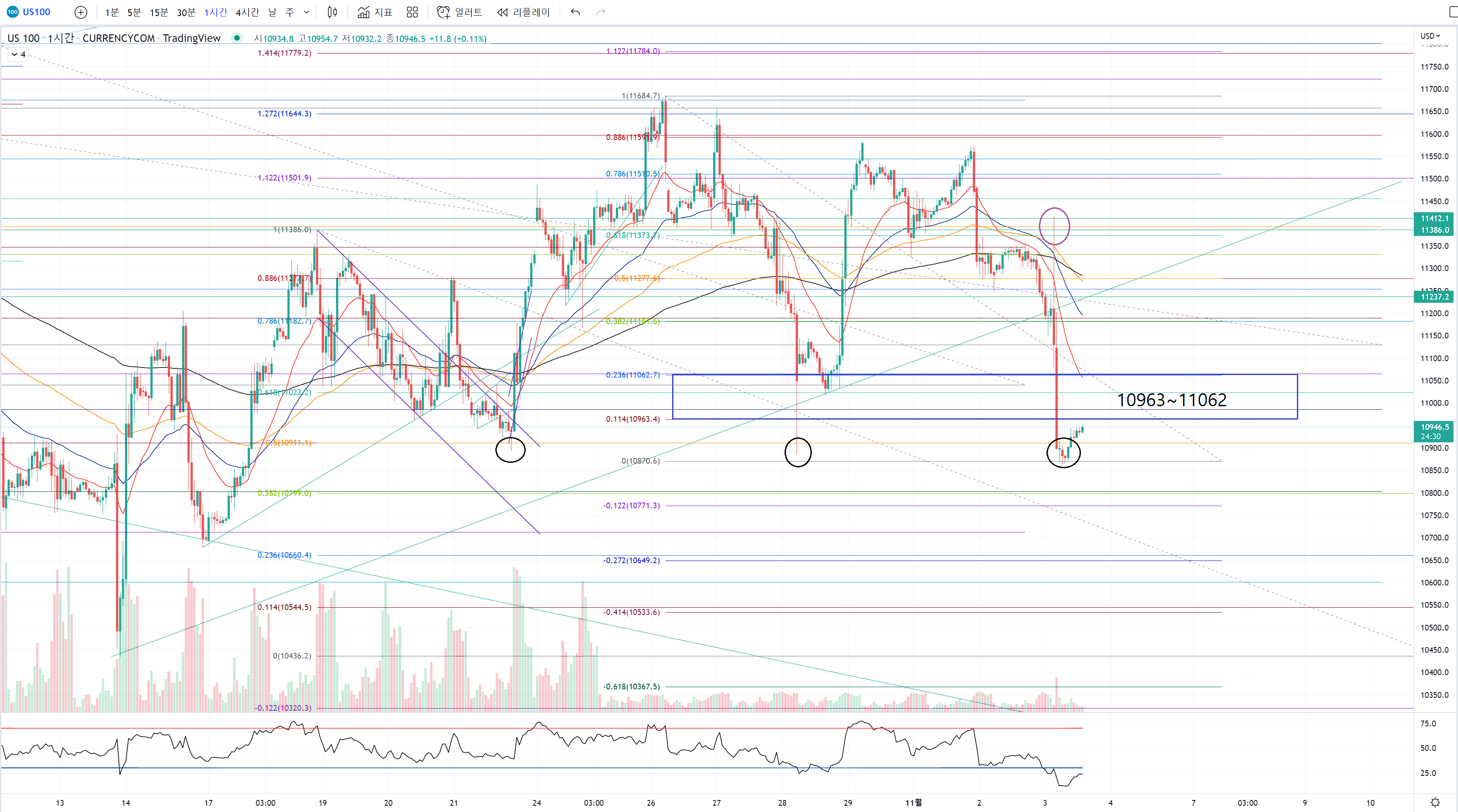 일단 10960~11060파랑색 구간을 어떻게 처리해주는지를 확인하고 매수 진입을 노려야합니다.
